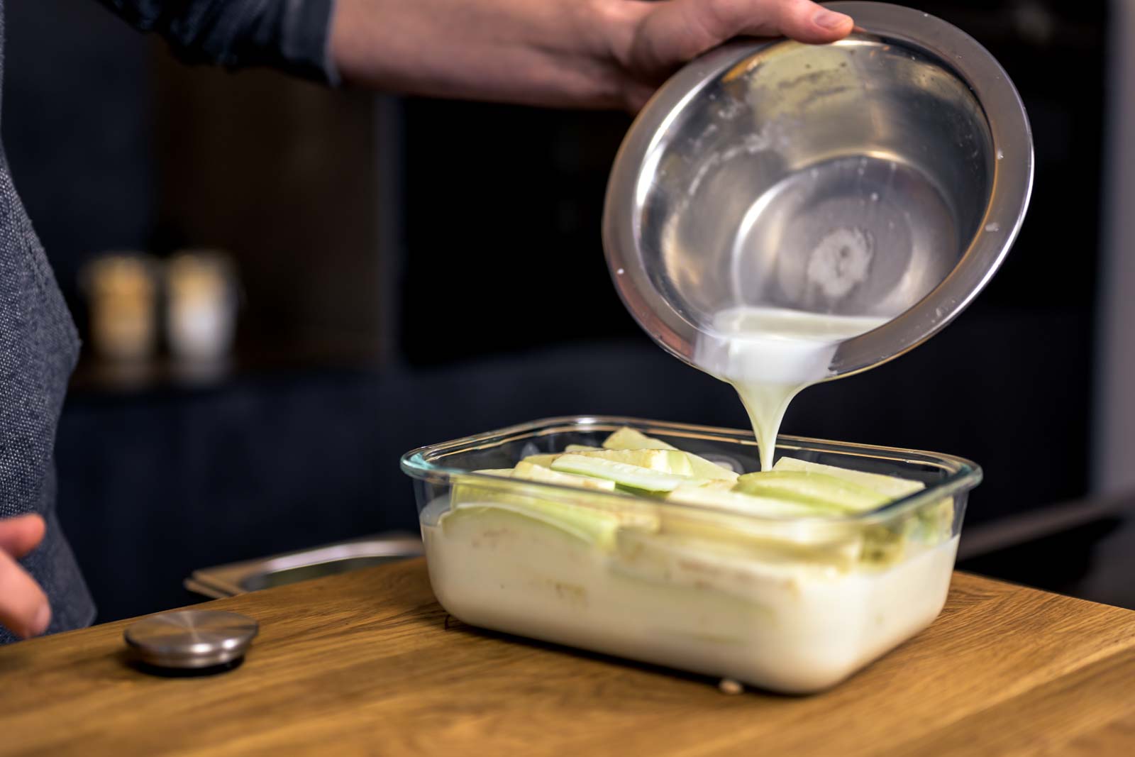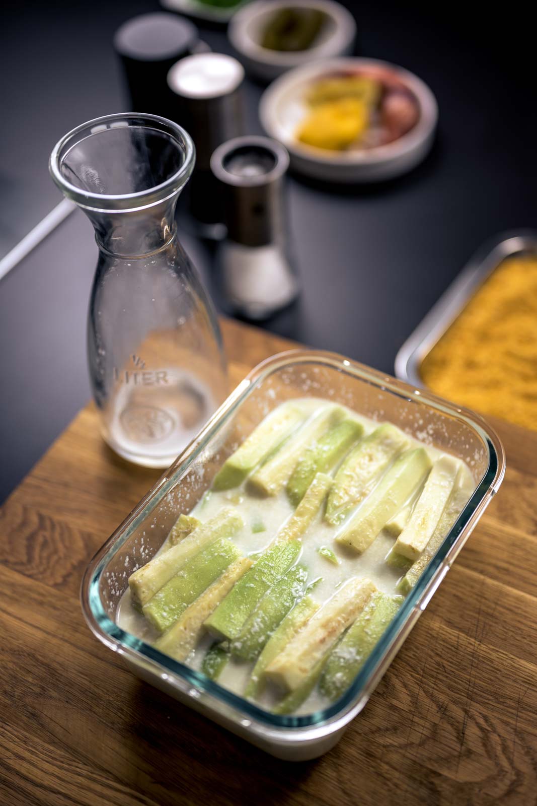 Die Auberginen schälen und in 1 cm dicke Stifte schneiden. Die Stifte nebeneinander in ein große, flache Schale legen. Die Milch mit Zitronensaft sowie 1/2 TL Salz mischen und über die Auberginen gießen. 60 min. ziehen lassen.