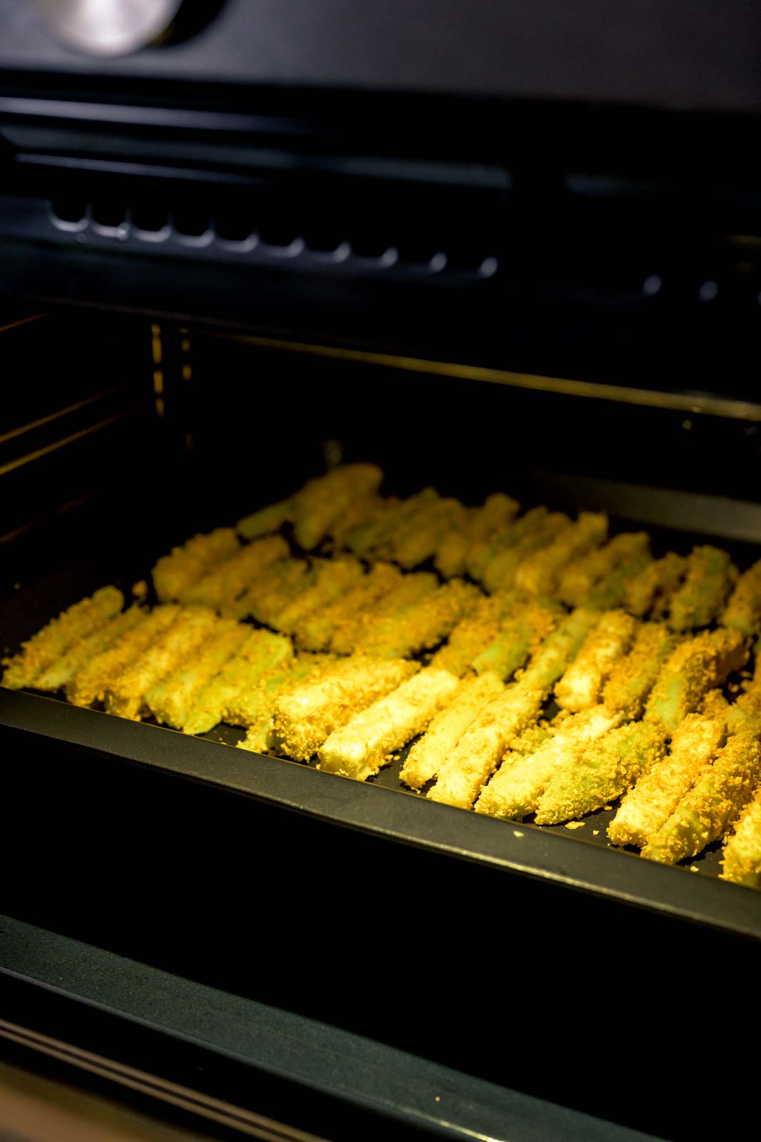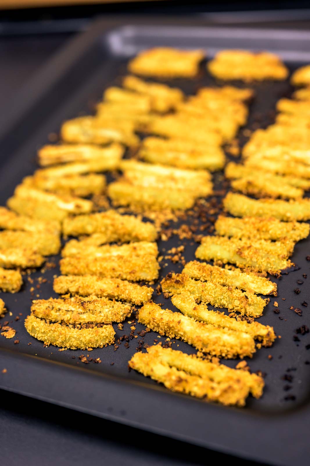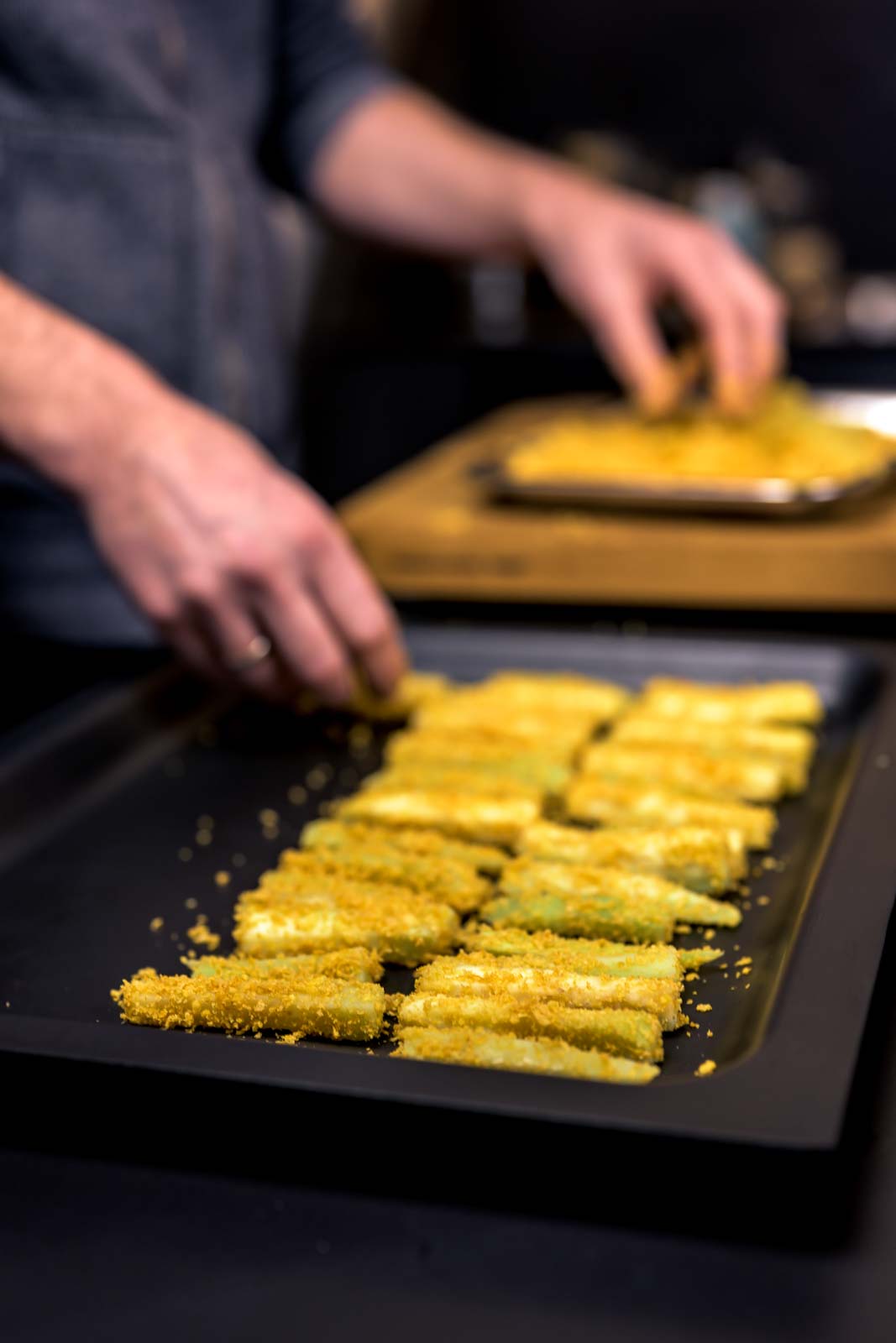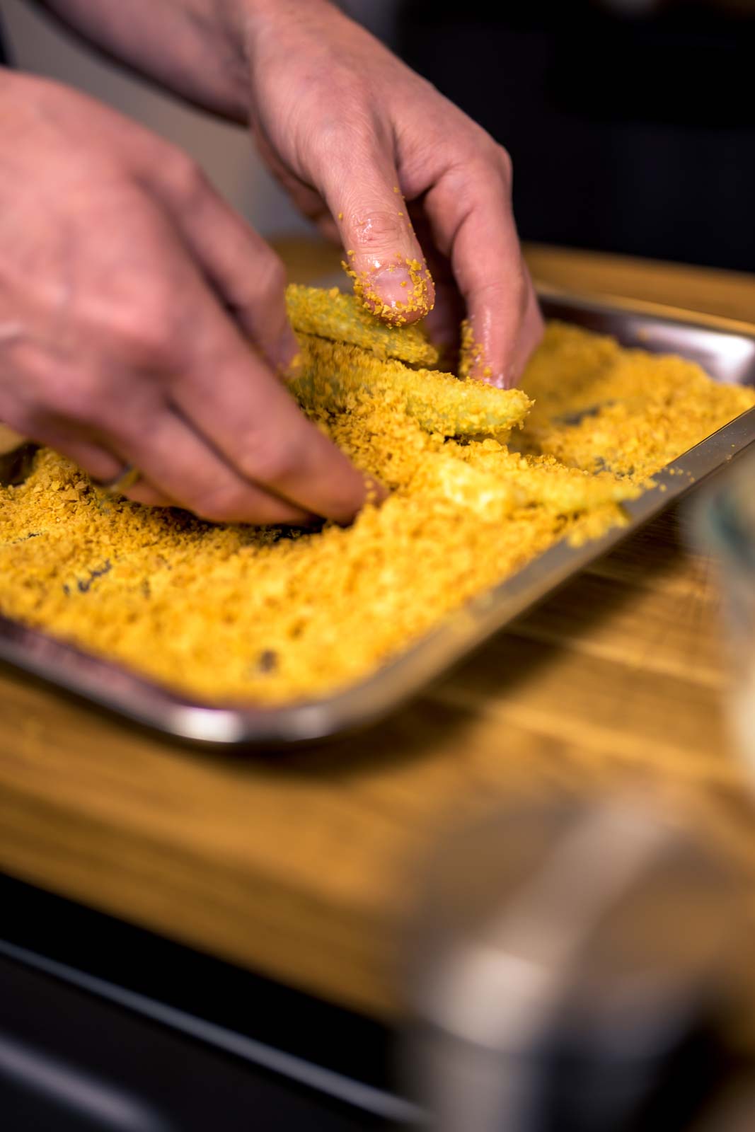 Die Cornflakes fein mahlen und mit dem Zitronenabrieb und Salz würzen. Die Auberginenstücke abtropfen lassen und rundherum, gleichmäßig in den Cornflakes panieren. Auf ein Backblech mit Backpapier legen, mit Olivenöl beträufeln und bei 220 °C ca. 15-20 min. knusprig braun backen.