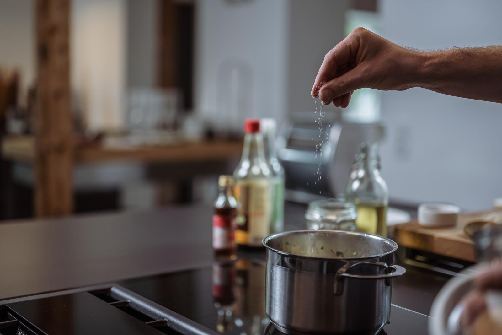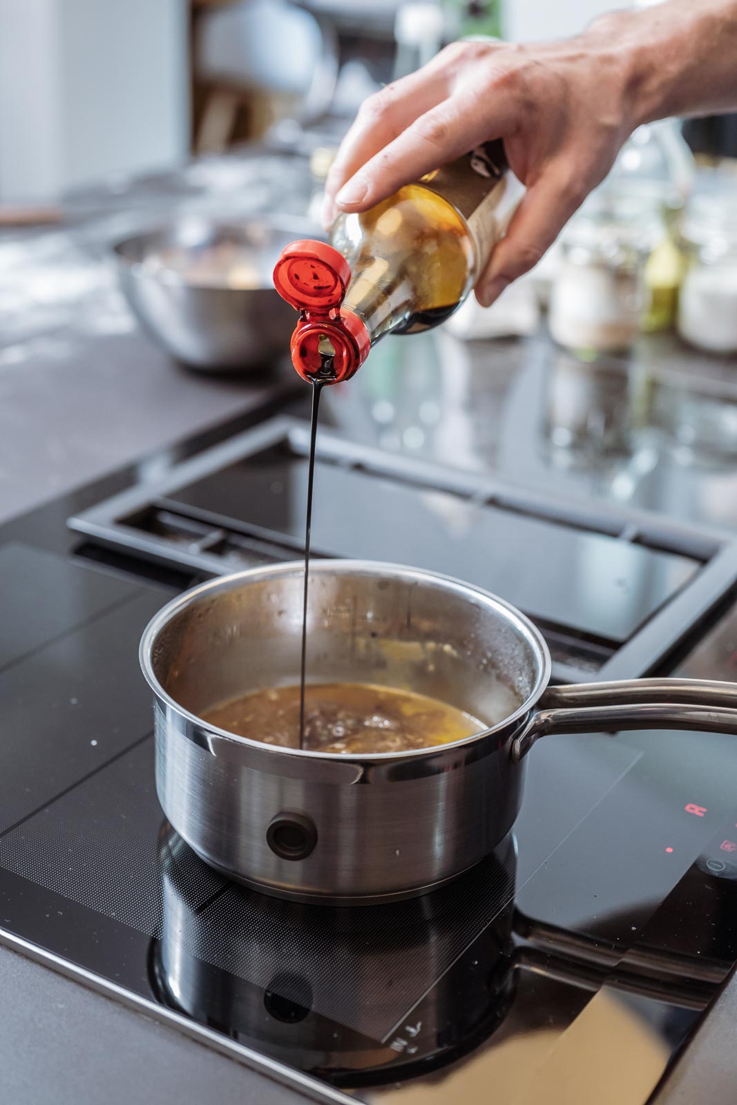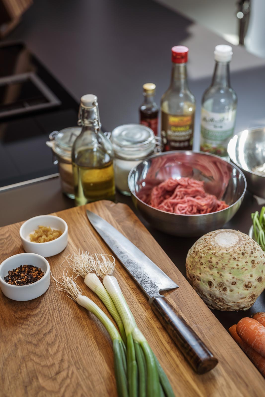 - Sojasoße, Reis-Essig, Chili-Flocken und Sesam-Öl zum Abschmecken.