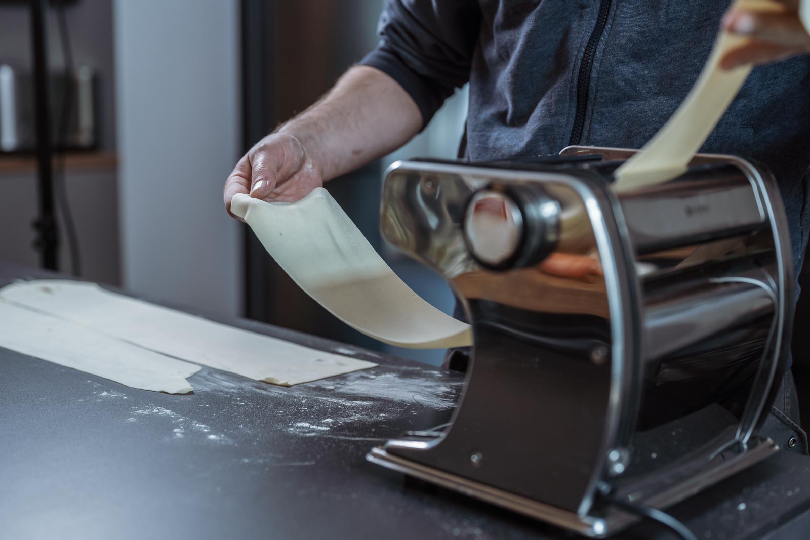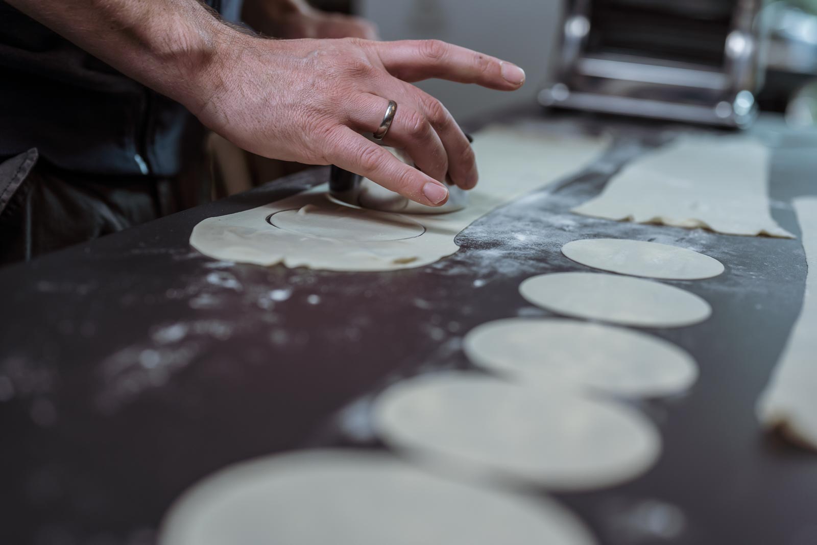 Mit einer Nudelmaschine den Teig bis zur dünnsten Stufe ausrollen, leicht bemehlen und dann mit einem runden Metallring (z.B. 8 cm großer Servierring) Kreise ausstechen.