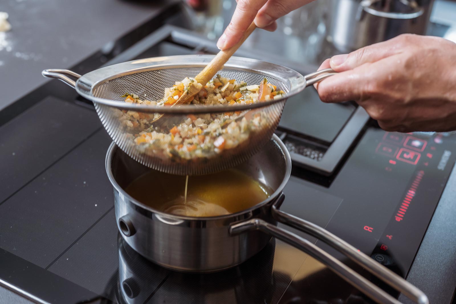 Wenn die Brühe fertig ist, alles durch ein Sieb gießen und den Sud mit Sesamöl, Sojasauce, Reisessig, Salz und Chili kräftig abschmecken.