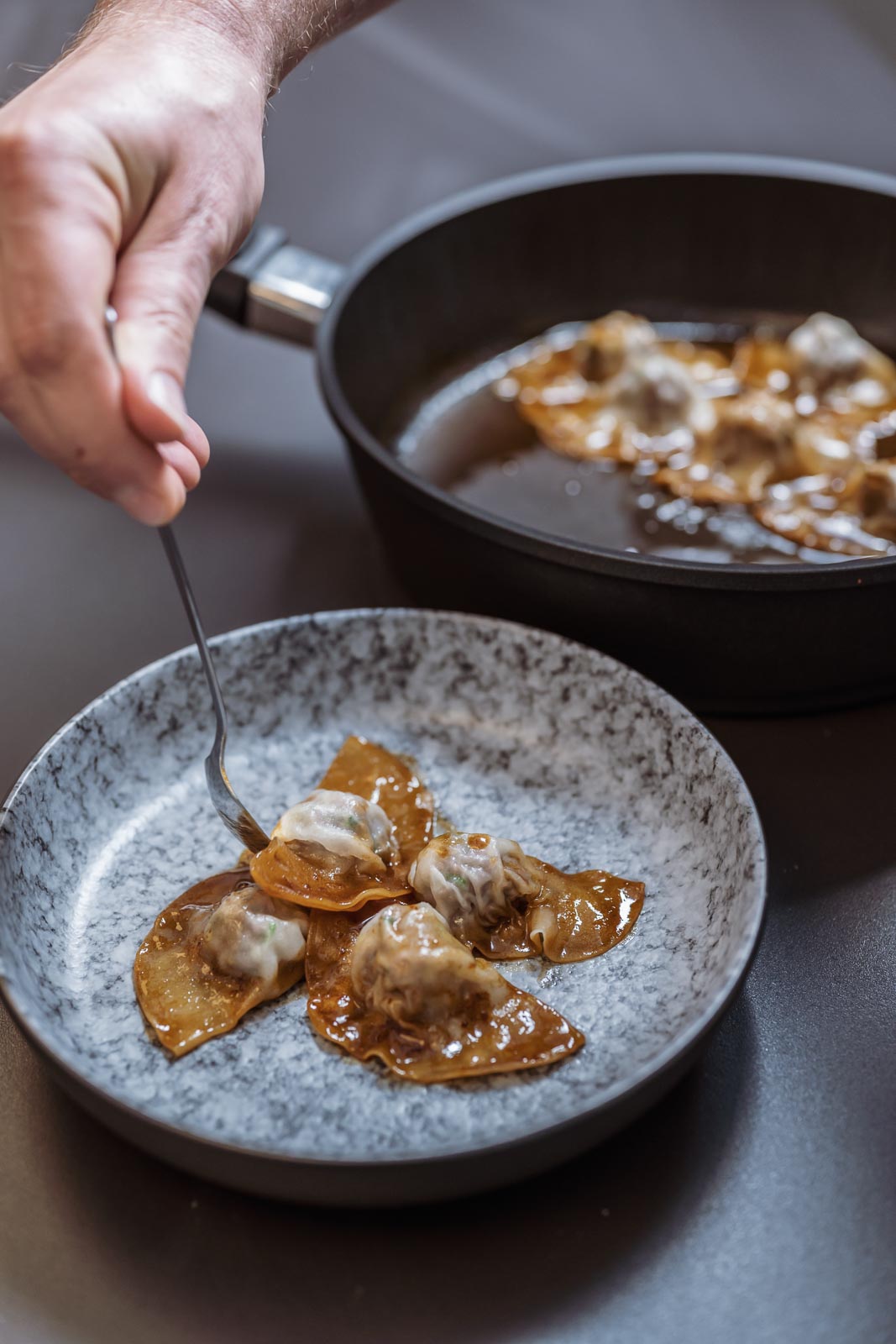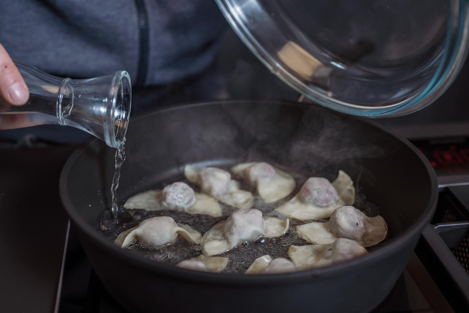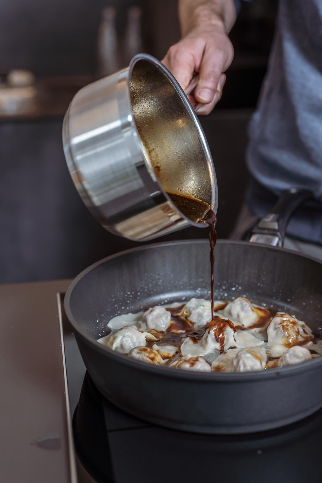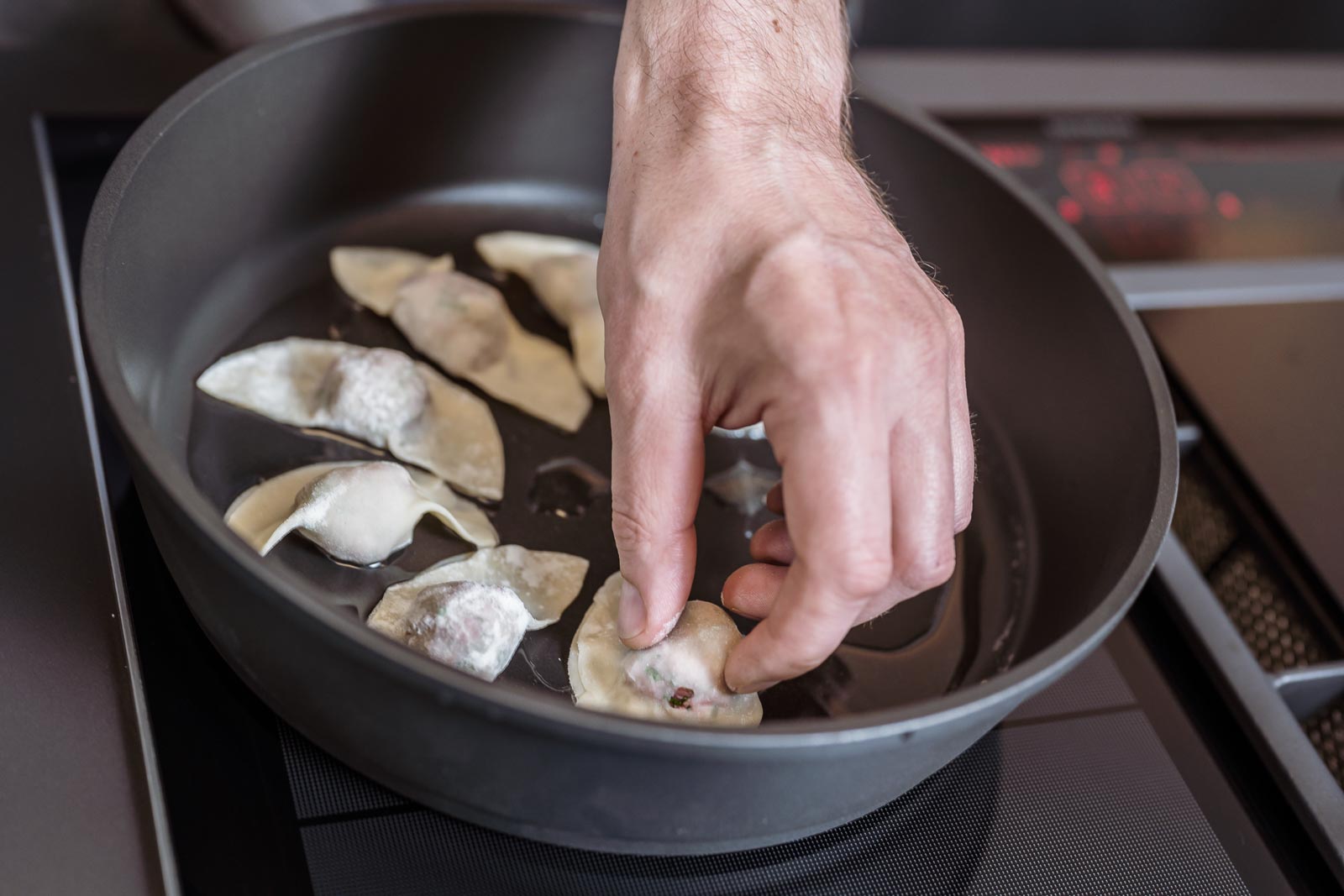 Die Dumplings in einer beschichteten Pfanne in reichlich Rapsöl anbraten. Wenn der Boden leicht gebräunt ist, etwa 100 ml Wasser zufügen und sofort einen passenden Deckel auf die Pfanne setzen. Nach etwa 1-2 min. den Deckel abnehmen und das Wasser fast verkochen. Das Kochfeld ausschalten und ca. 50 ml des Gemüsesud dazu gießen. Wenn die Soße leicht andickt, die Teigtaschen sofort mit fein geschnittener Frühlingszwiebel servieren.
