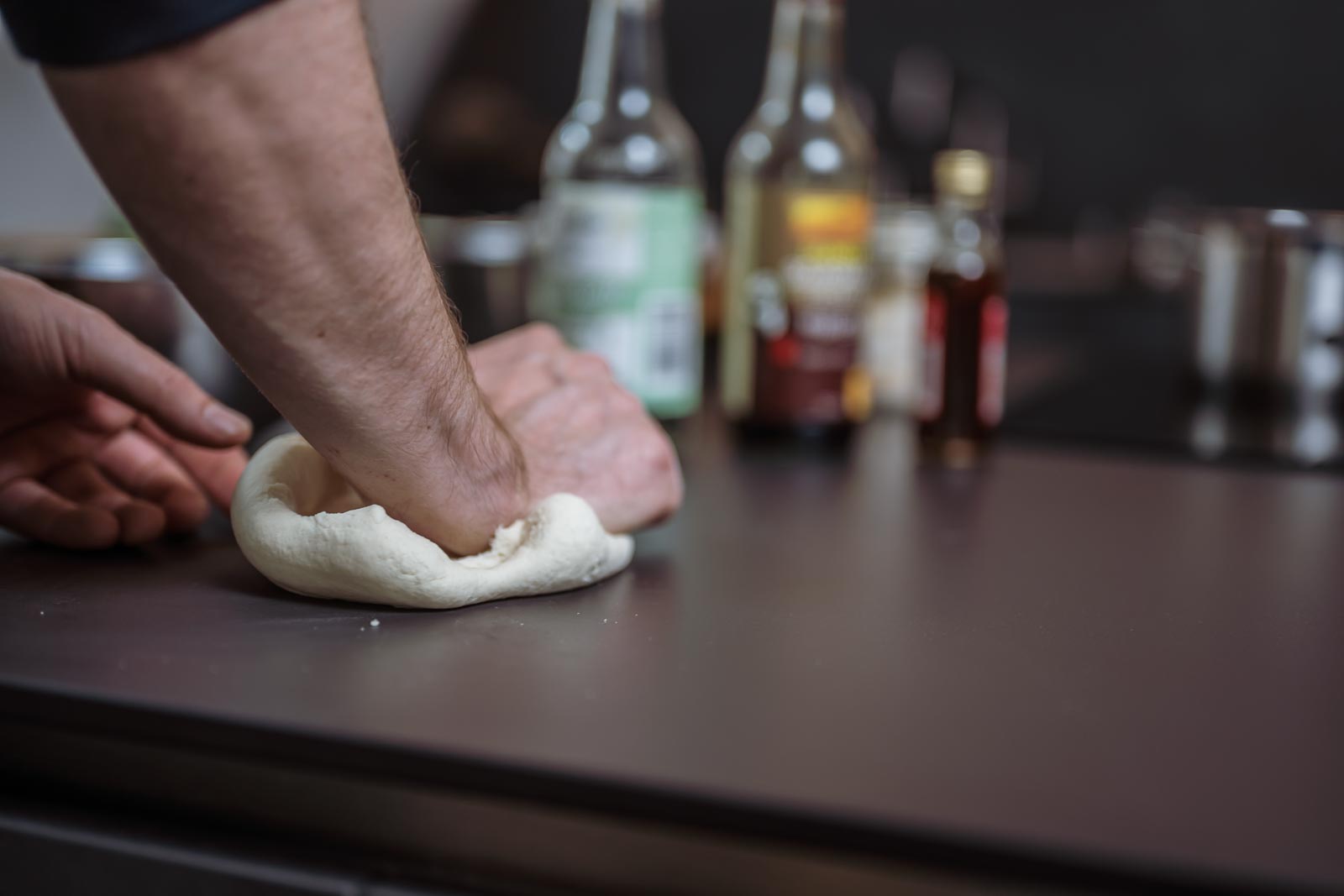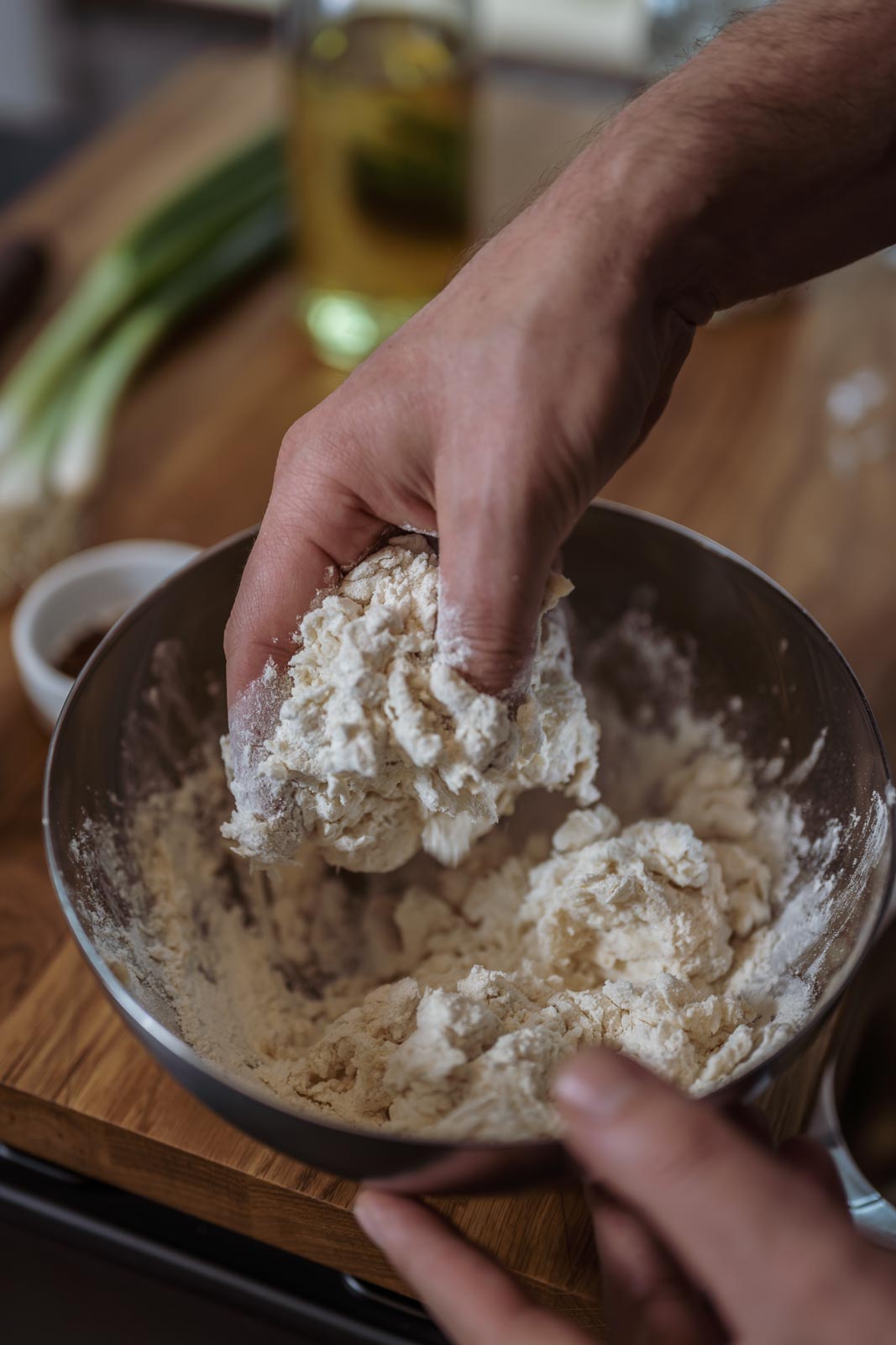 Mehl, heißes Wasser, Rapsöl und Salz zu einem glatten, elastischen Teig verkneten, in Folie schlagen und 30 min. ruhen lassen.