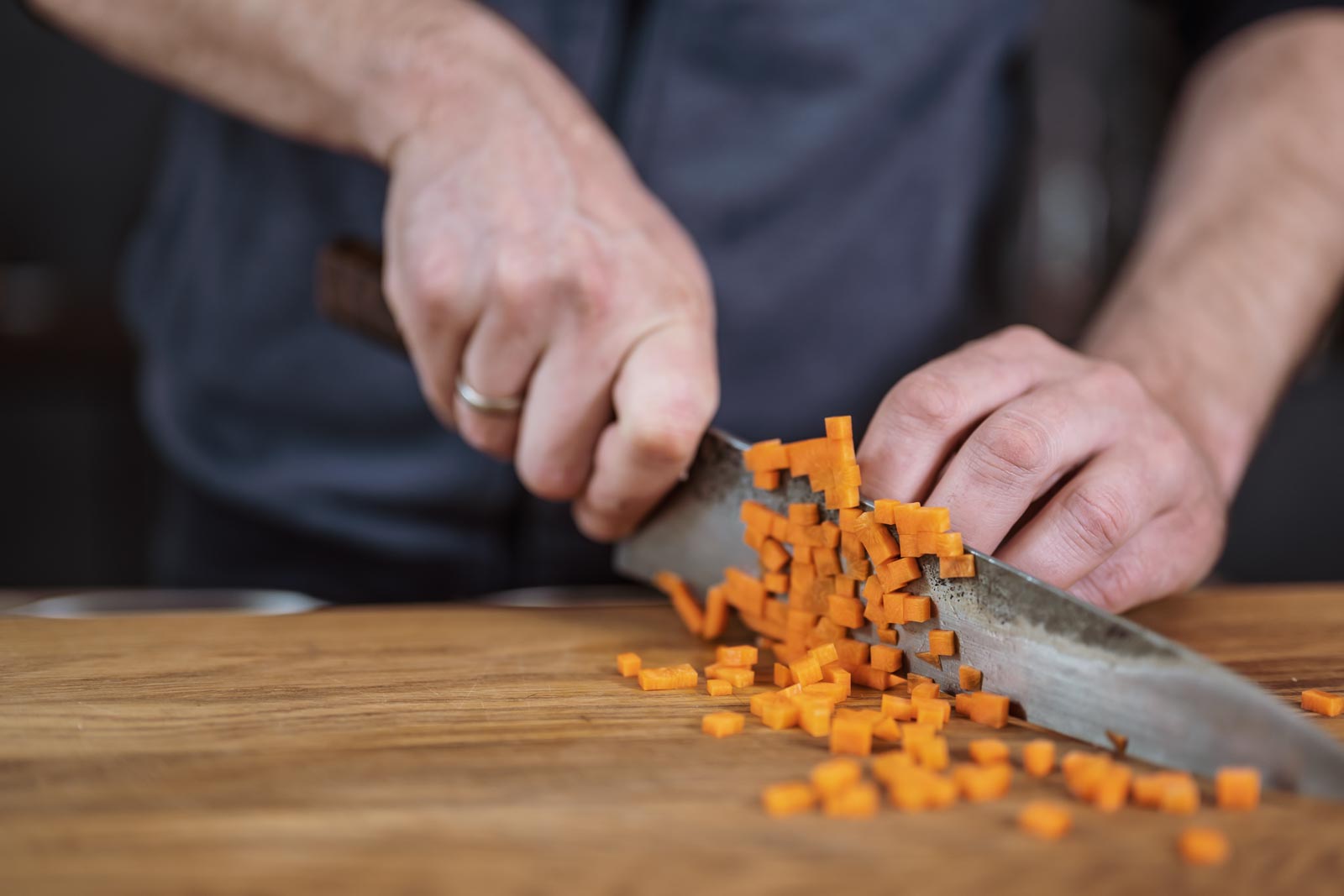 In der Zwischenzeit Sellerie und Möhren schälen und fein würfeln. Die Zwiebel und Knoblauchzehe abziehen und ebenfalls fein würfeln. Die Petersilie mit Stängel fein schneiden.