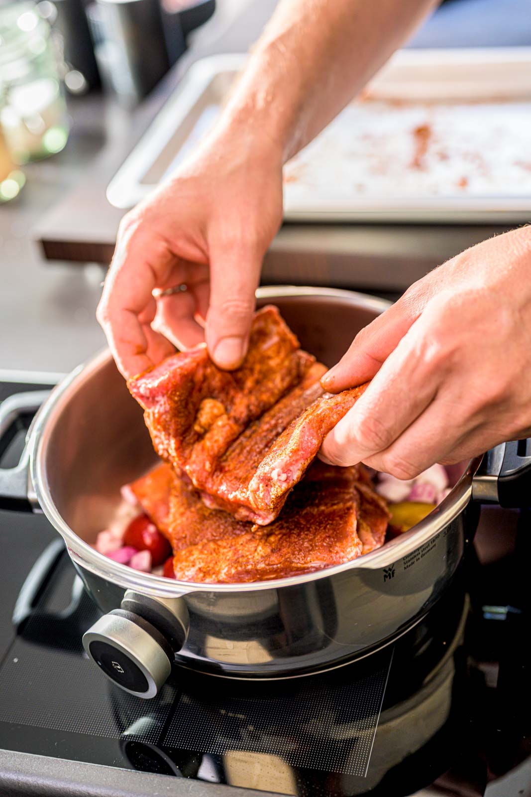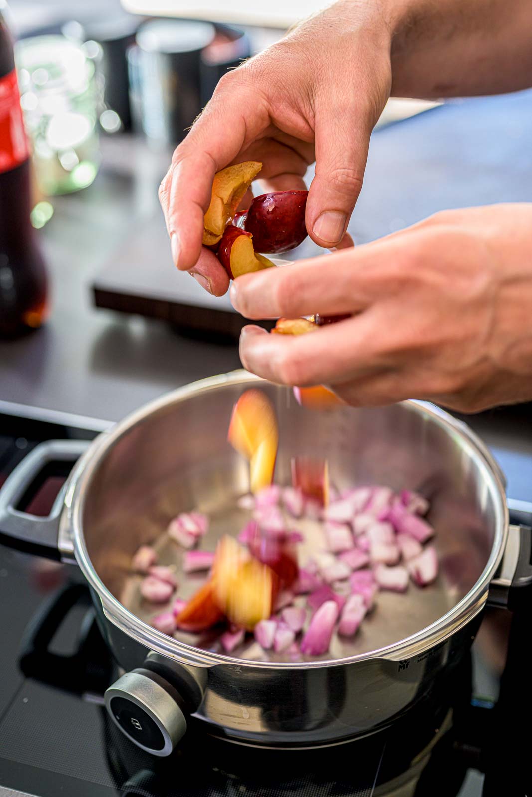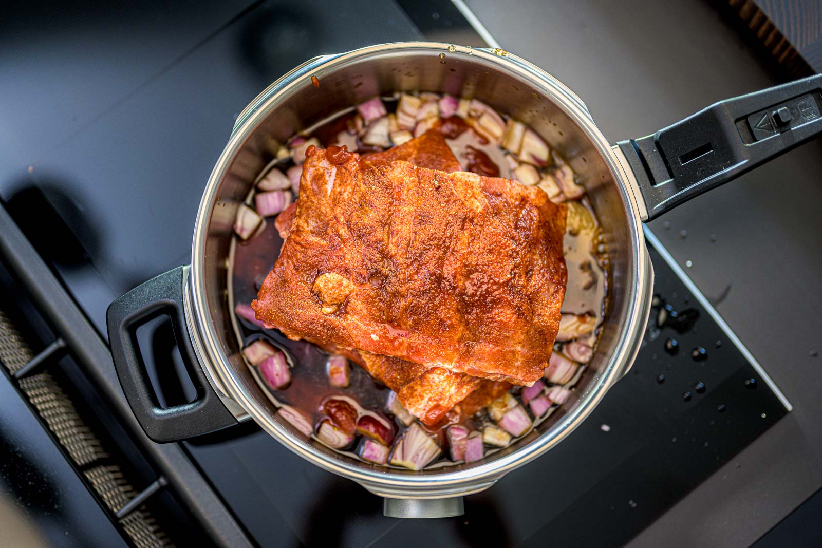 Die Zwiebeln schälen und grob würfeln. Die Pflaumen halbieren und entkernen. Beides in den Schnellkochtopf geben und darauf die Rippchen platzieren. Cola, Curry-Ketchup und Jägermeister-scharf zufügen.
