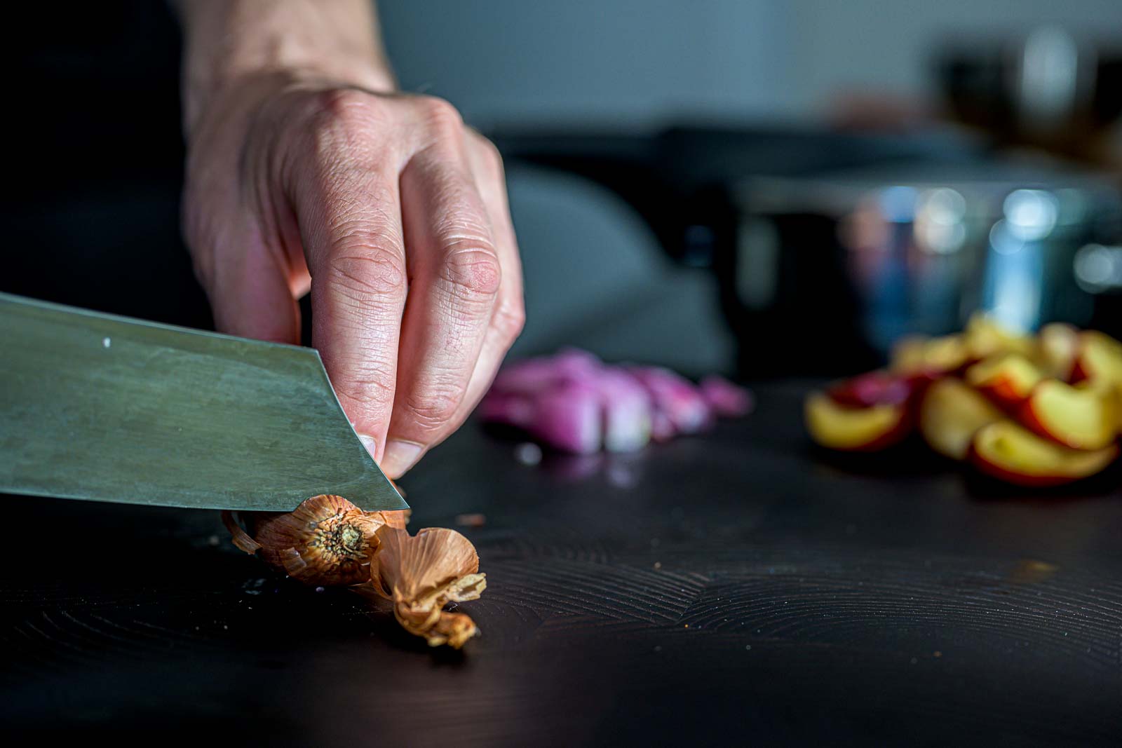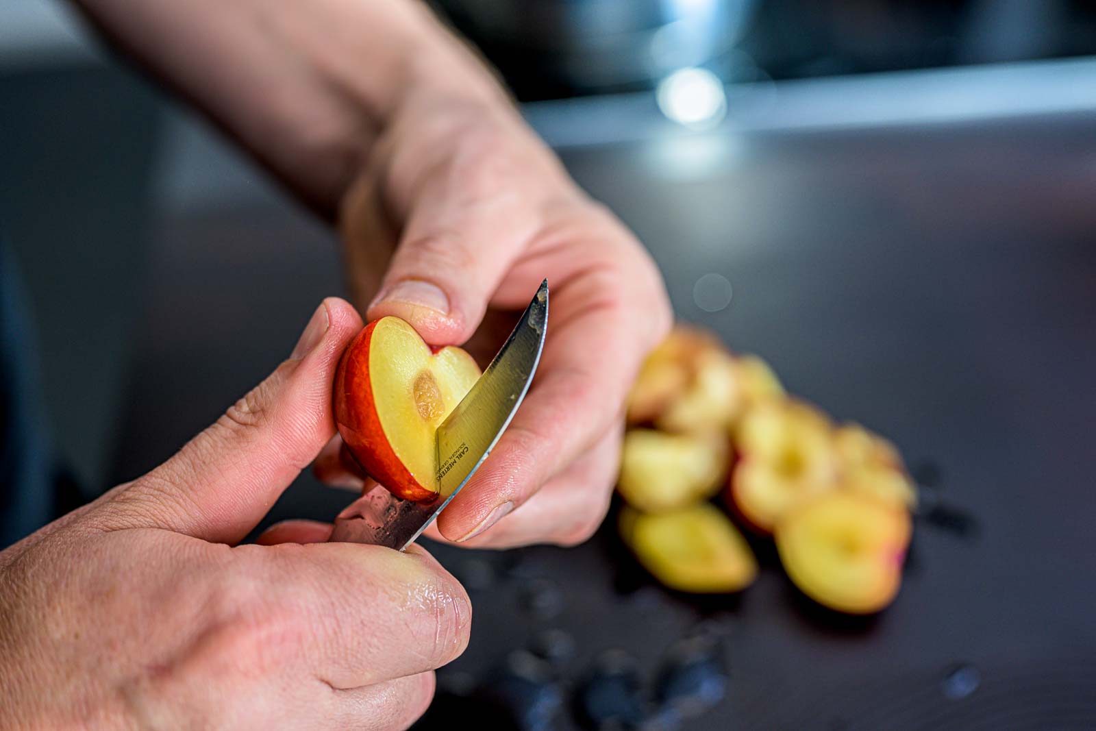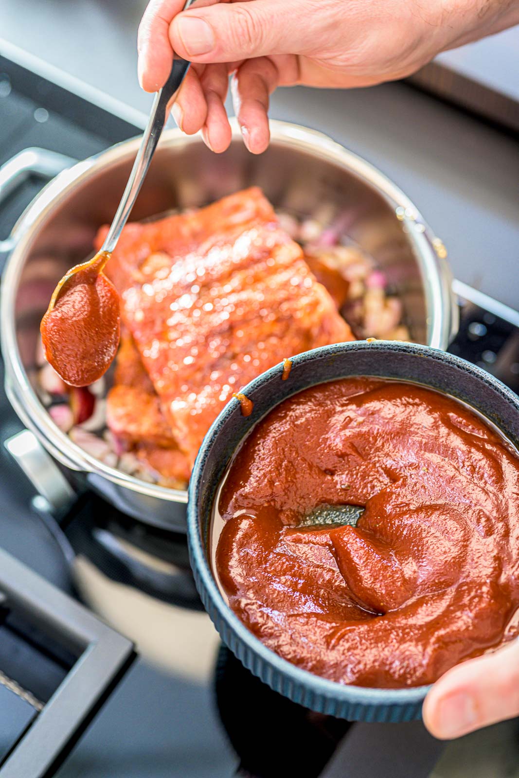 Die Zwiebeln schälen und grob würfeln. Die Pflaumen halbieren und entkernen. Beides in den Schnellkochtopf geben und darauf die Rippchen platzieren. Cola, Curry-Ketchup und Jägermeister-scharf zufügen.