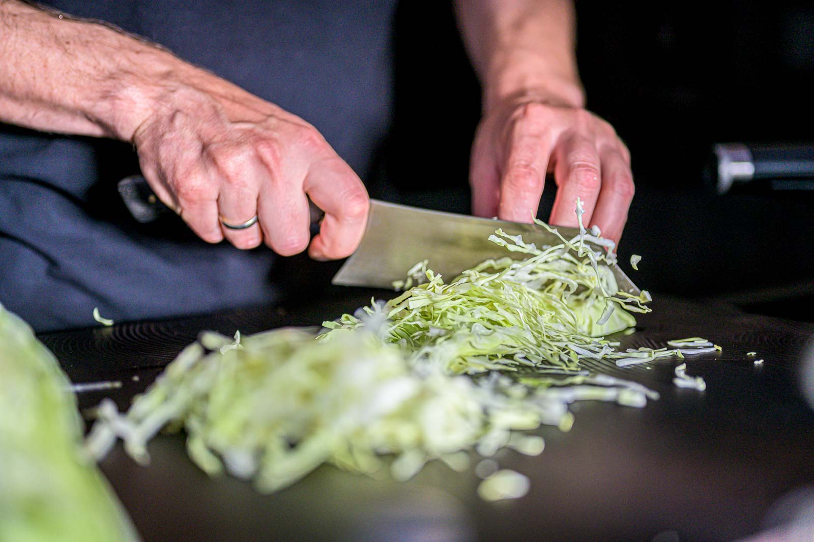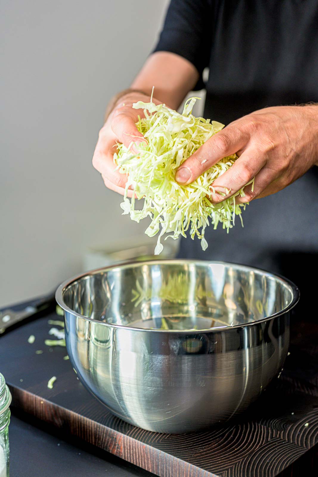 Den Kohl vierteln, den Strunk entfernen und in sehr feine Streifen schneiden.