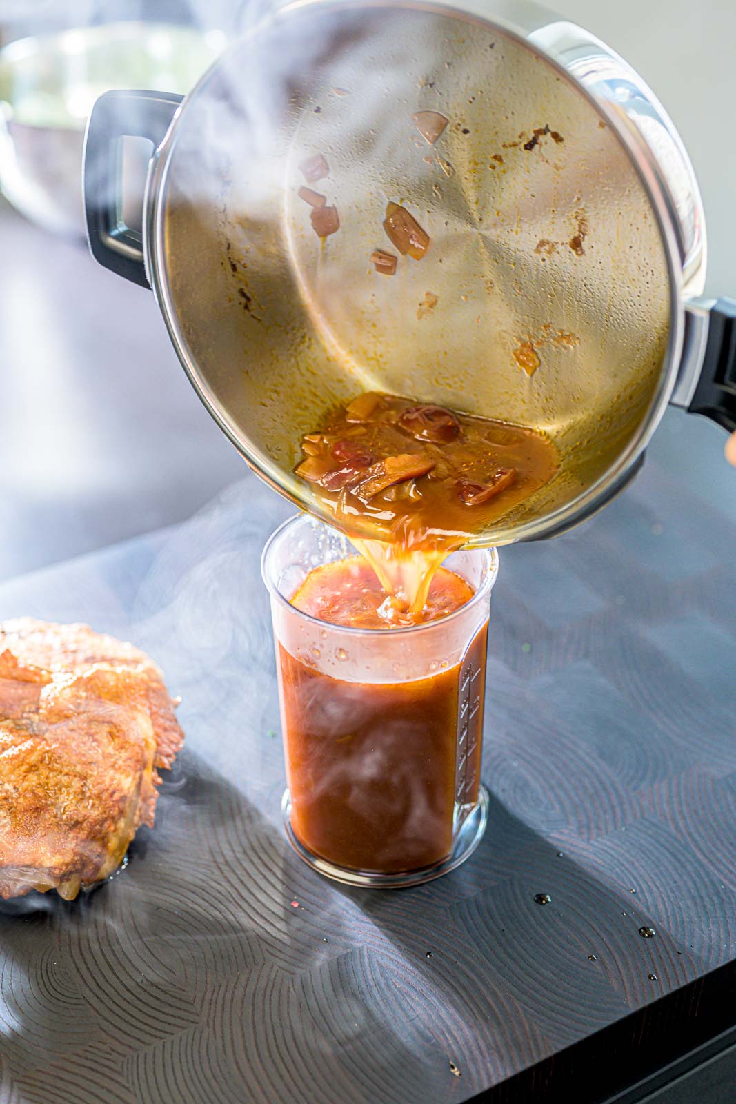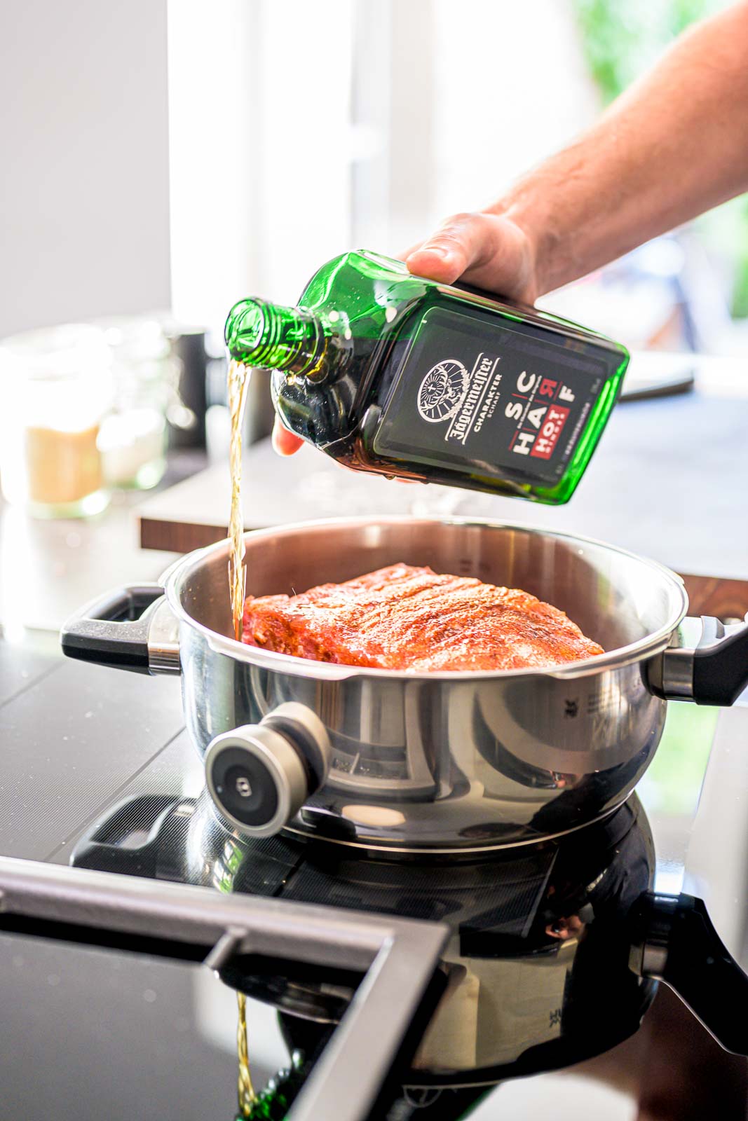 Die Rippchen aus dem Jägermeister-Sud nehmen und den Sud sehr fein pürieren. Bis zu einer dickflüssigen Konsistenz einkochen und mit Soja-Sauce und Balsamico abschmecken.