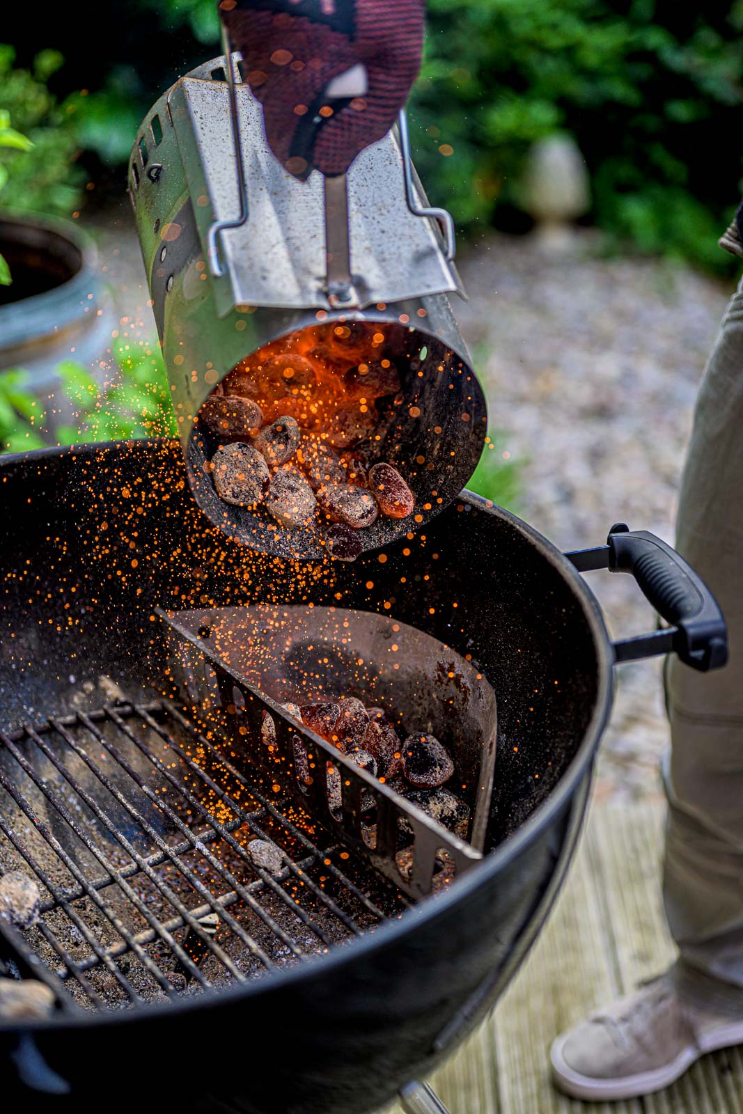 In der Zwischenzeit die Briketts für den Grill in einem Anzündkamin vorglühen. Wenn Sie gut durchgeglüht sind, die Briketts rechts und links in den Grill füllen, so dass in der Mitte keine direkte Hitze ist. Den Grill-Rost auflegen, den Deckel schließen und mit den Lufteinlässen die Temperatur auf etwas 250 Grad regeln.
