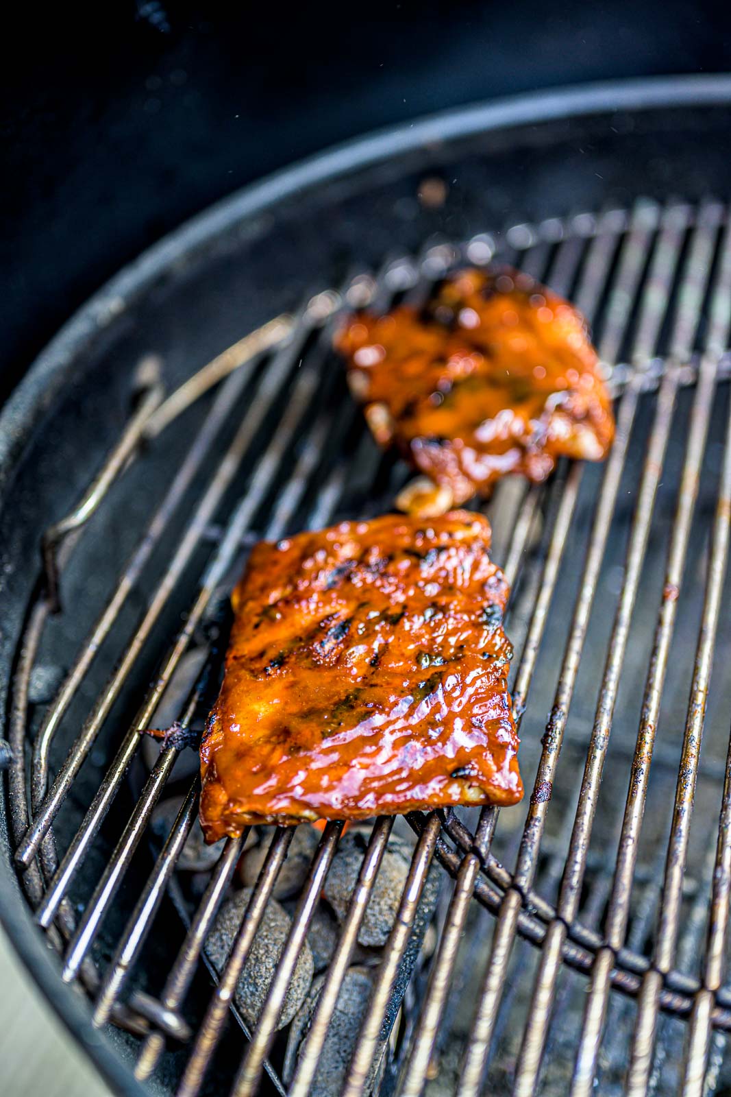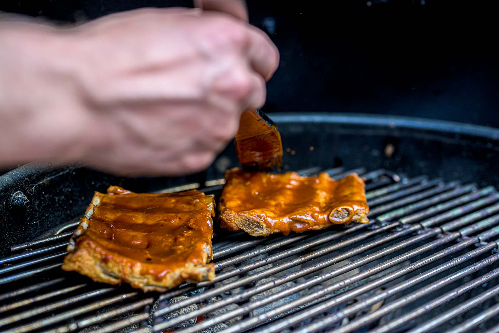 Die Rippchen auf die Hitze-Zone legen und von beiden Seiten anrösten. Dann mit reichlich BBQ-Sauce bestreichen und in der Mitte des Grillrosts ohne direkte Hitze mit geschlossenem Deckel karamellisieren lassen.