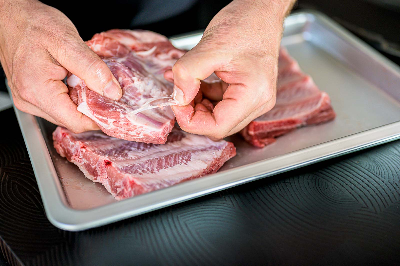 Vorab die Silberhaut von der Innenseite der Rippchen abziehen oder vom Metzger vorbereiten lassen.