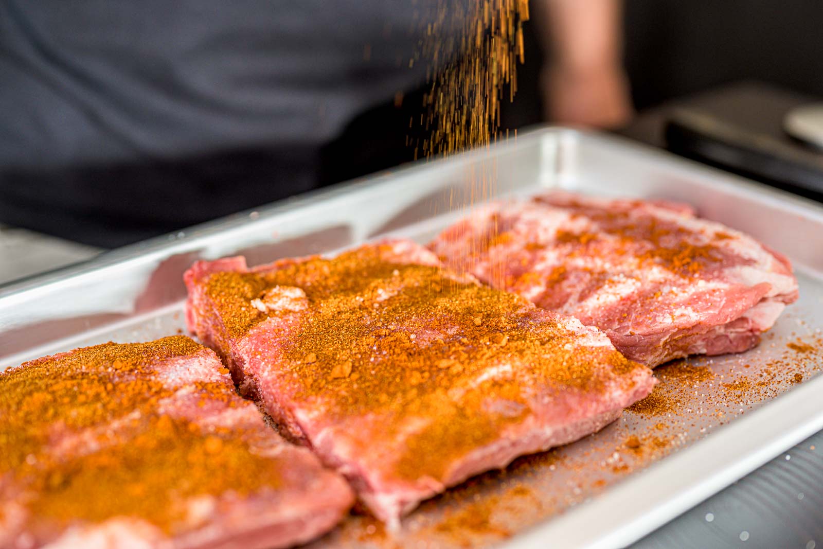 Zum Würzen einen Rub, also eine trockene Gewürzmischung aus Salz, Zucker, Paprikapulver und geräuchertem Paprikapulver mischen. Die Rippchen gleichmäßig rundherum damit bestreuen.