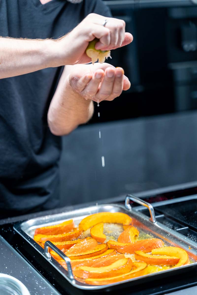 Den Kürbis vierteln, entkernen und in einigermaßen gleich große Spalten schneiden. In einer Pfanne (wenn vorhanden: eine Teppanyaki-Platte) in etwas Butterschmalz anbraten, bis die Spalten zwar weich, jedoch nicht matschig sind. Mit Salz würzen. Mit dem Limettensaft ablöschen und den Kürbis in eine Schale geben. Die Zwiebel grob würfeln und im Bratansatz in etwas Rapsöl weich dünsten. Alle Gewürze dazu geben und ebenfalls kurz anrösten. Schließlich die Schale der Salzzitrone fein würfeln, zu den Zwiebeln geben und alles in die Schale mit den Kürbisspalten geben und gut vermischen. Mit einem Klecks Creme Fraiche servieren.
