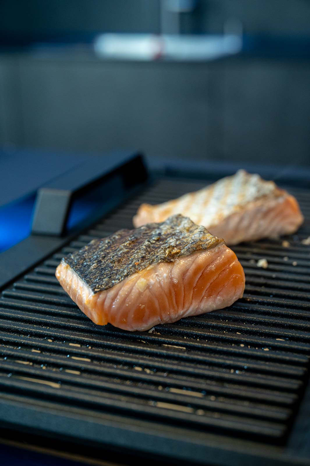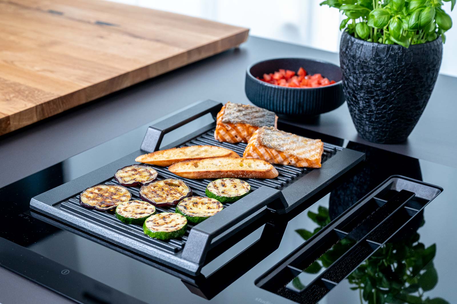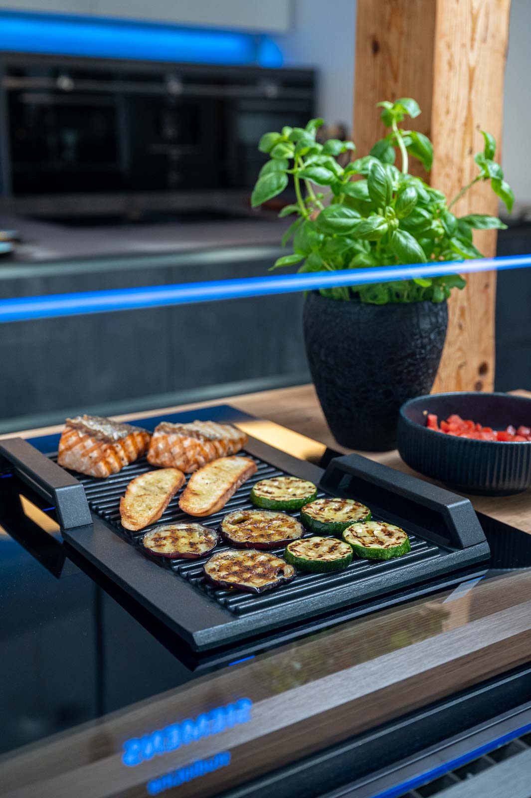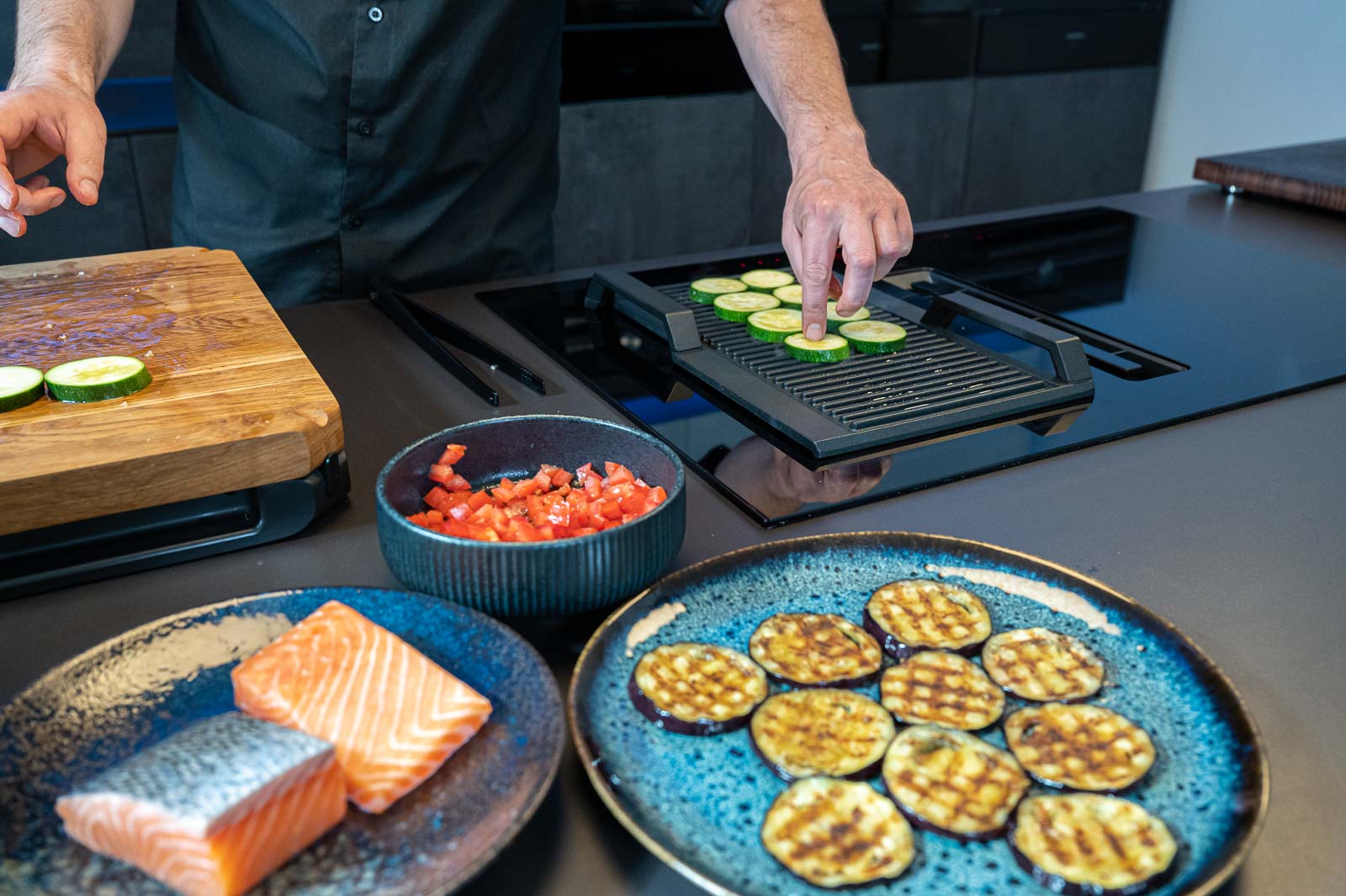 Exklusive Inspiration zum Indoor-Grillen – so nennt es XXXLutz auf seiner Webseite. Für die Kooperation der Möbelhauses mit Siemens grillt Torsten Kluske Lachs und Gemüse für ein geröstetem Ratatouille Baguette. Im Fokus neben dem Rezept steht natürlich wieder Hardware von Siemens Home: das inductionAir Plus Induktionskochfeld.