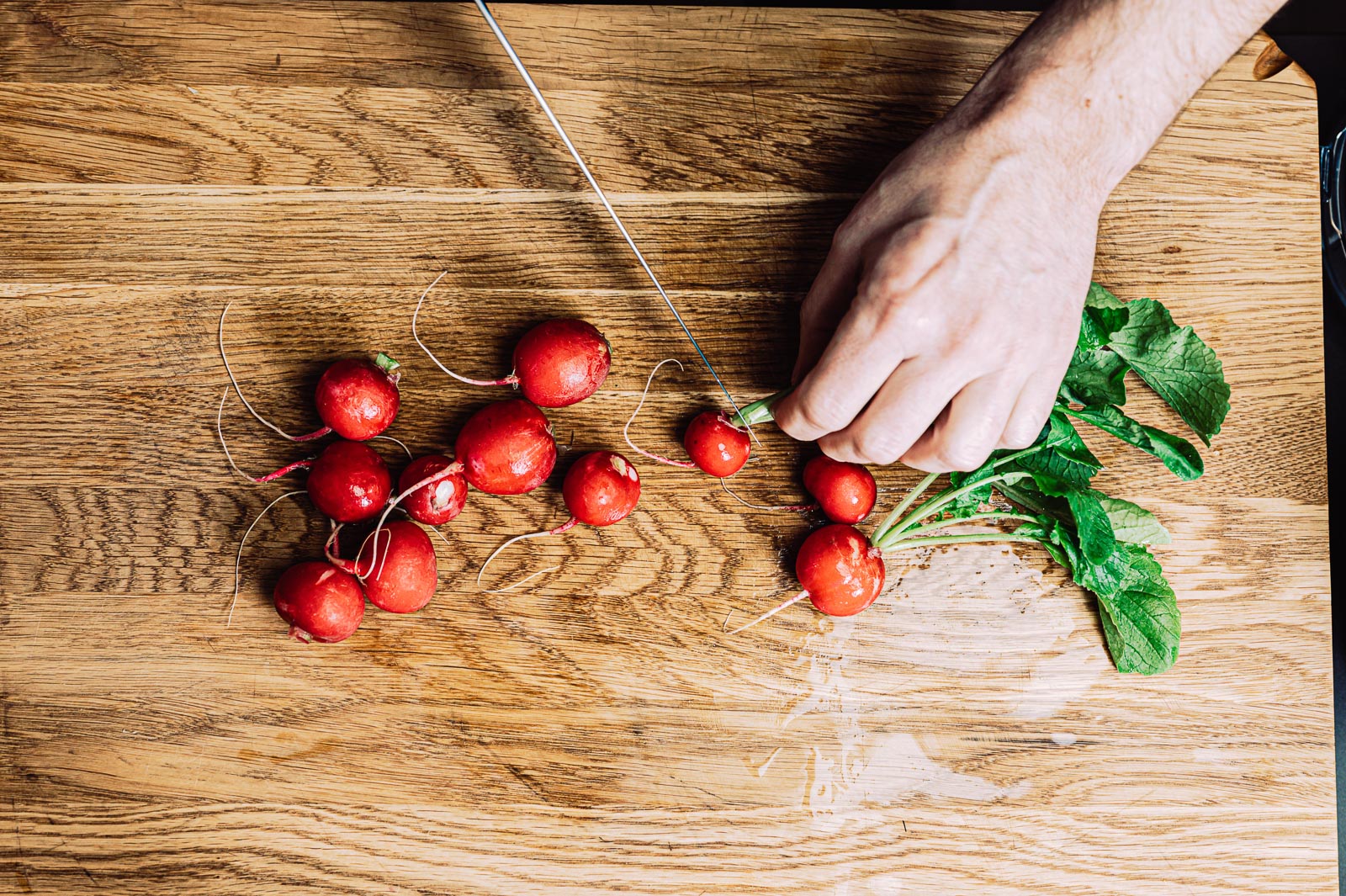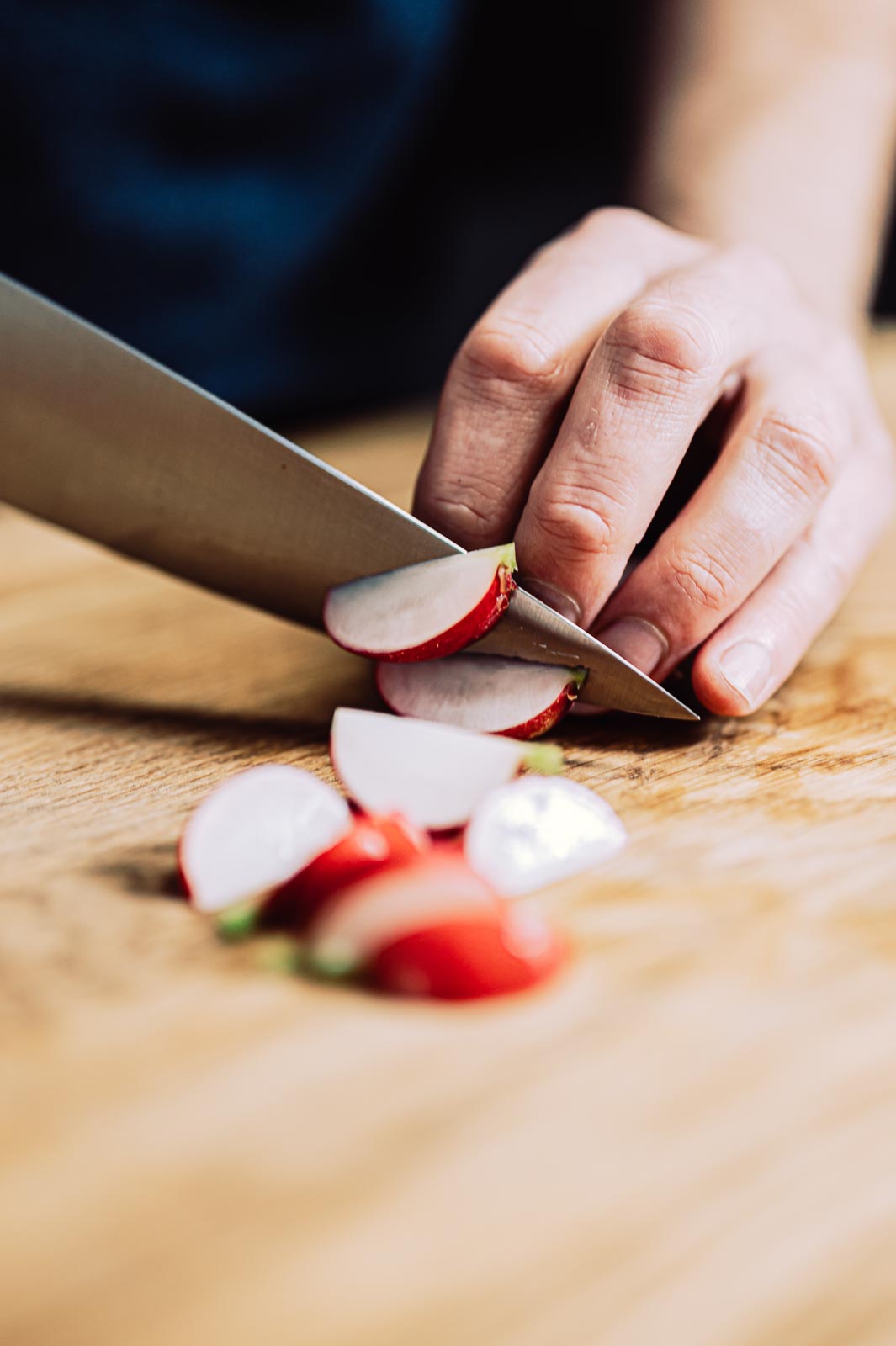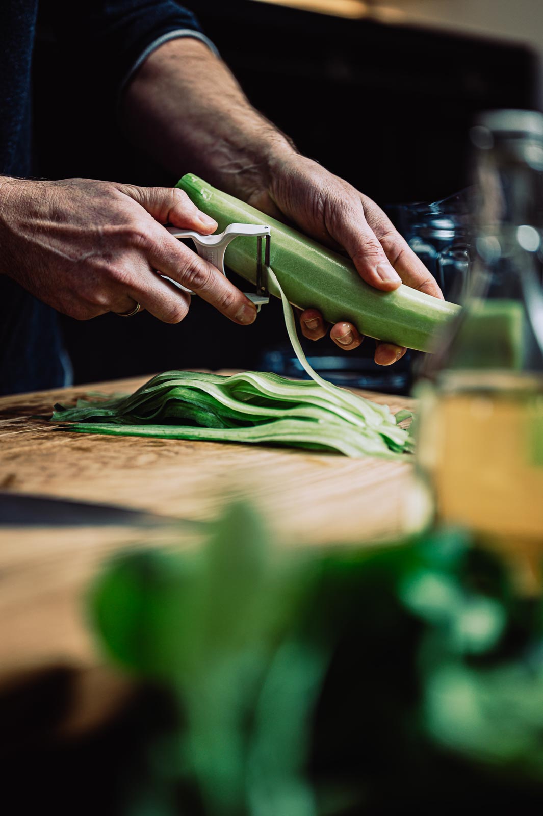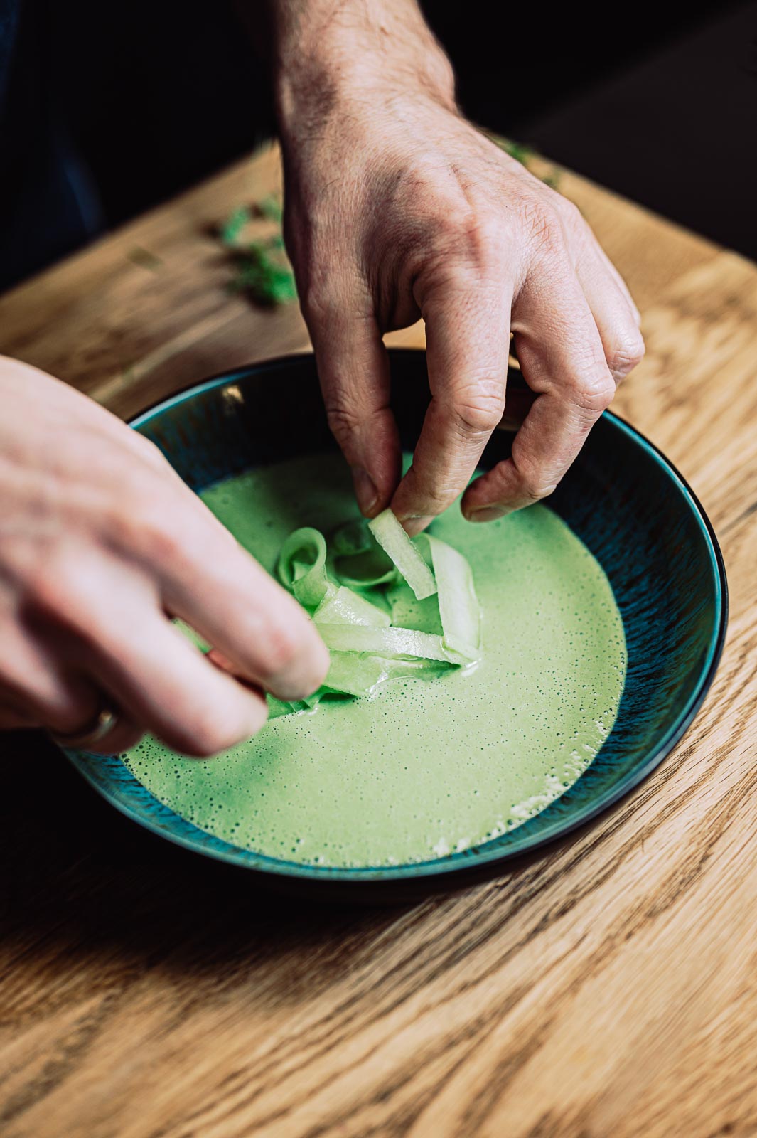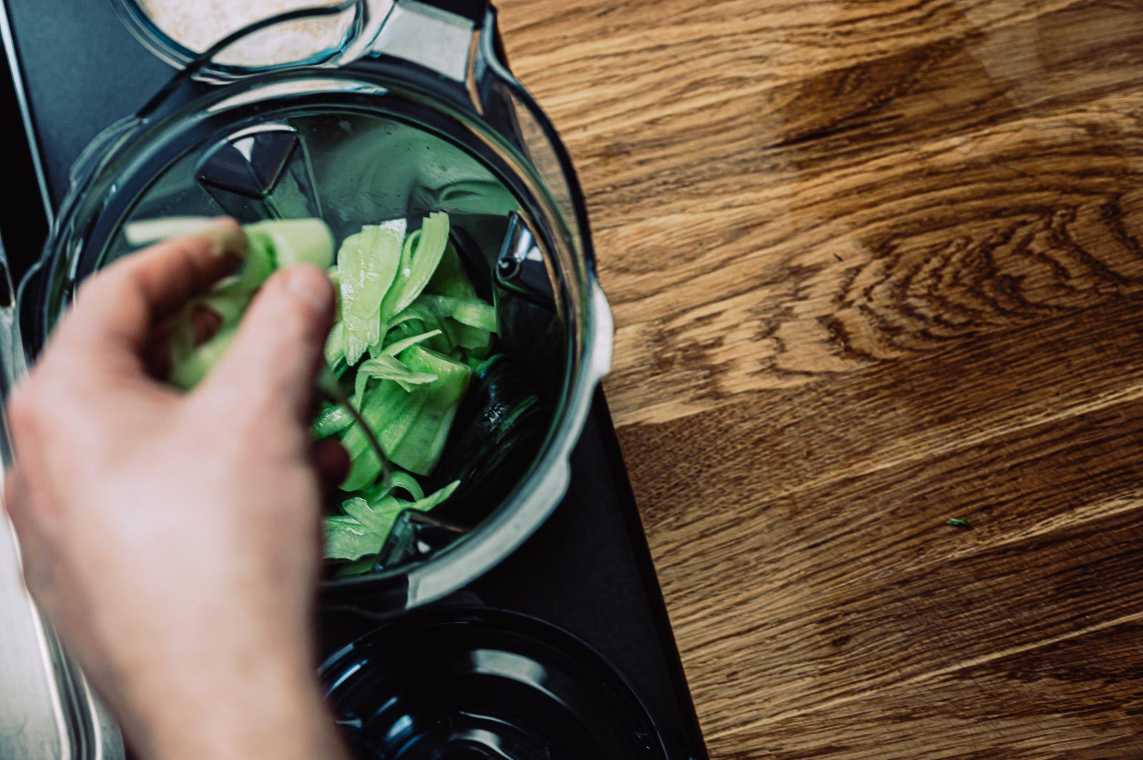 Die Gurken waschen und mit einem Sparschäler bis auf das Kerngehäuse in Streifen schneiden. Die Streifen dritteln. Die übrigen Kerngehäuse grob zerkleinern und in einen Mixbecher geben. Buttermilch, das Grün der Radieschen, den Saft der Limette,