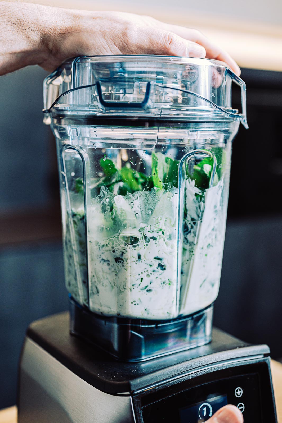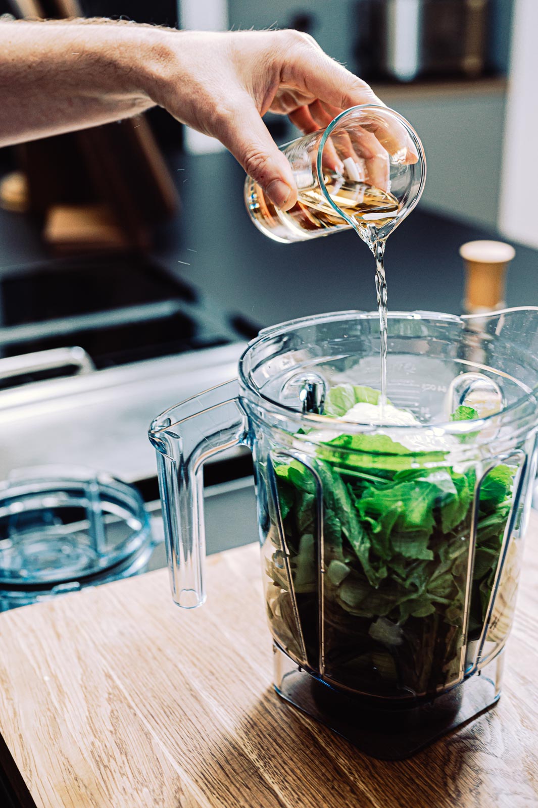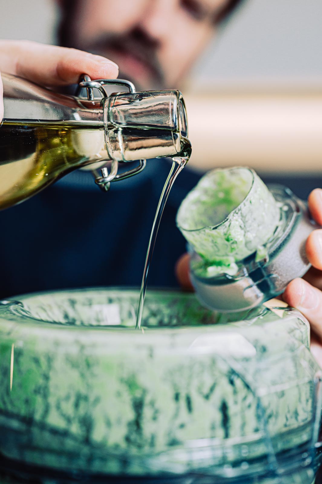 Dann weiter mixen und dabei langsam das Rapsöl hineinlaufen lassen.