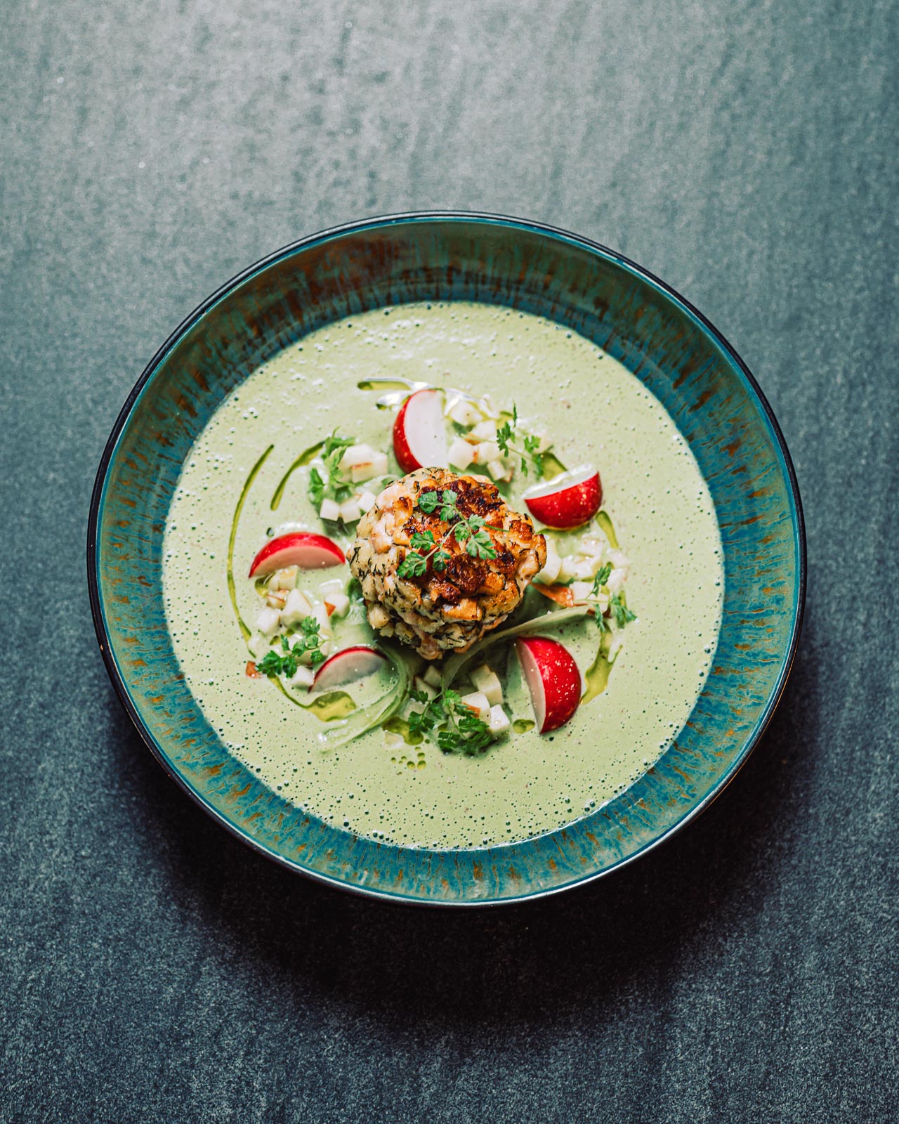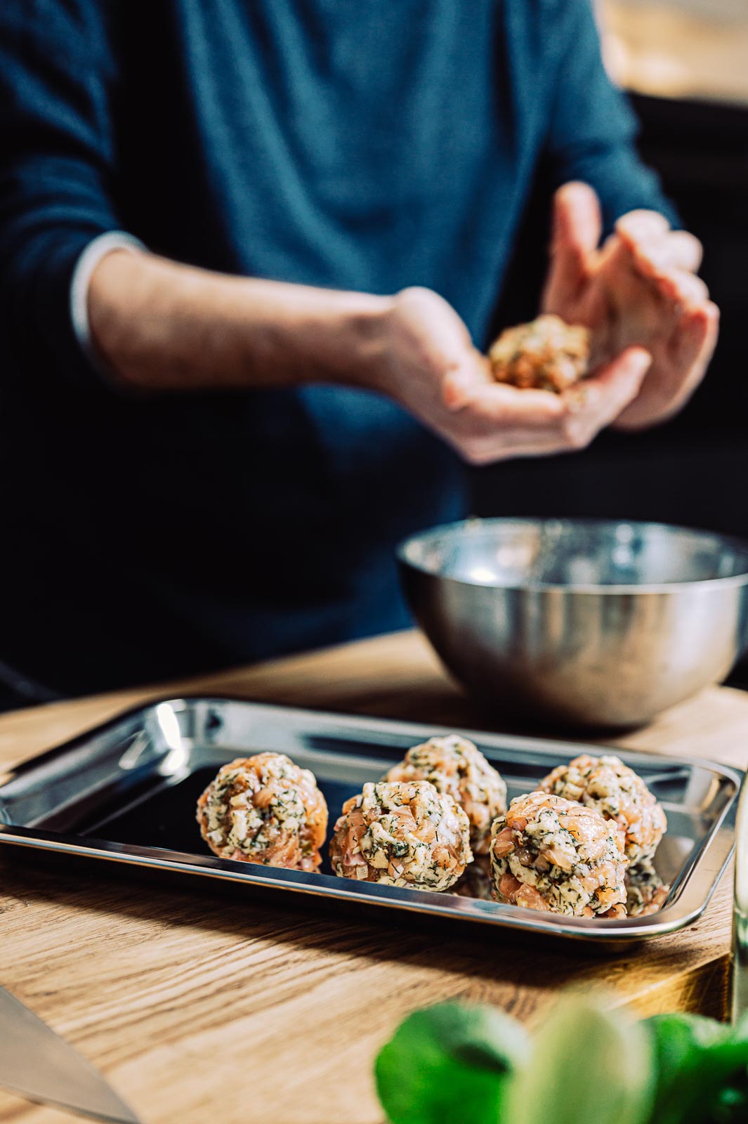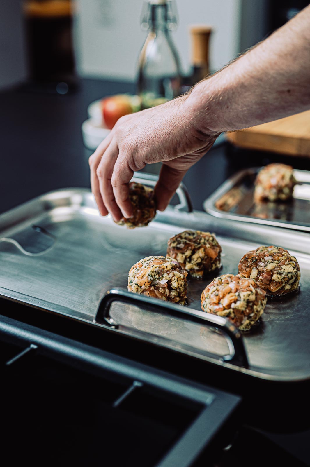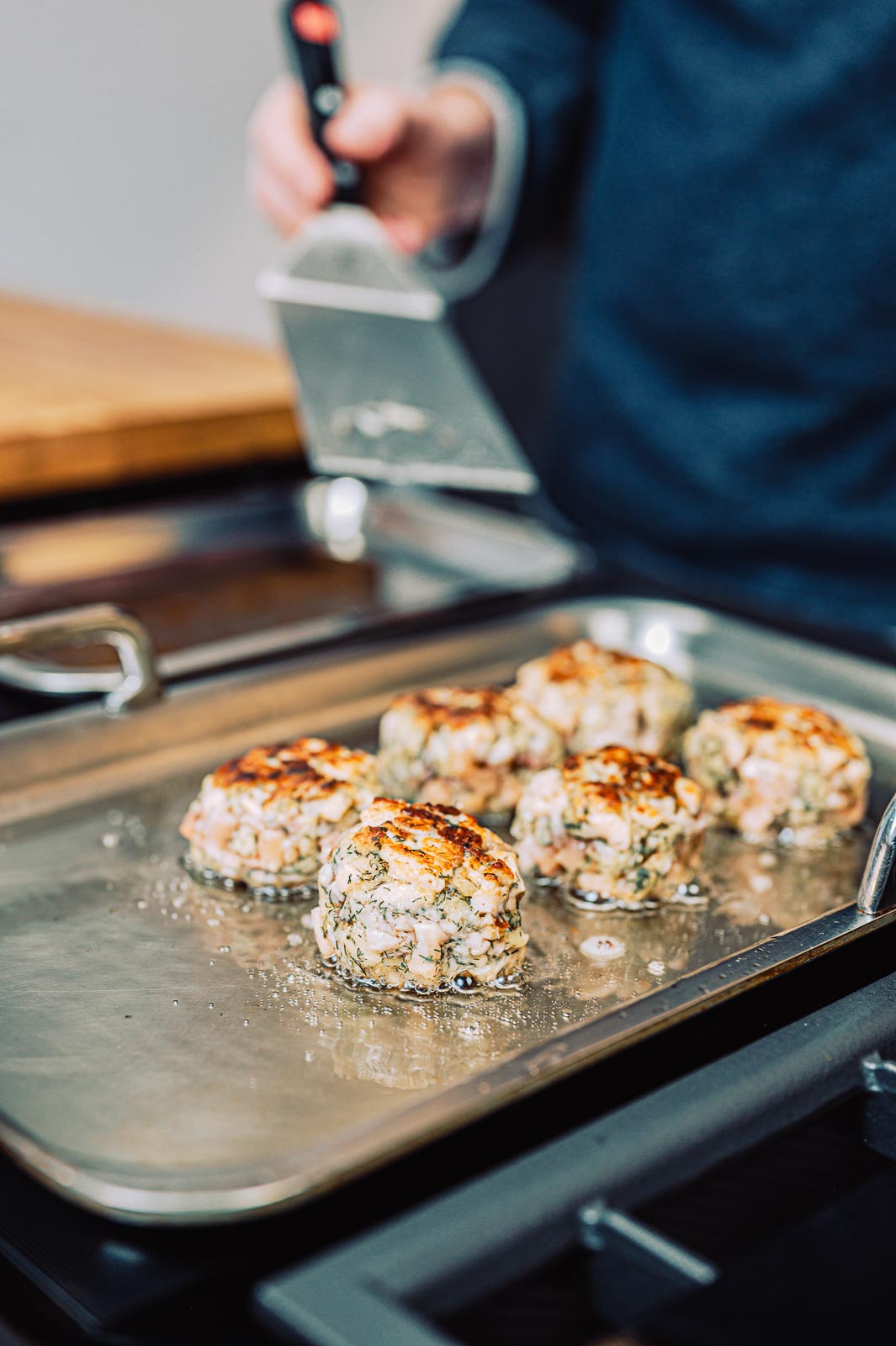 Mit einem Eisportionierer oder den Händen 4-6 kleine Lachs-Pralinen formen und diese in einer Pfanne bei mittlerer Hitze in Rapsöl rundherum goldbraun braten.