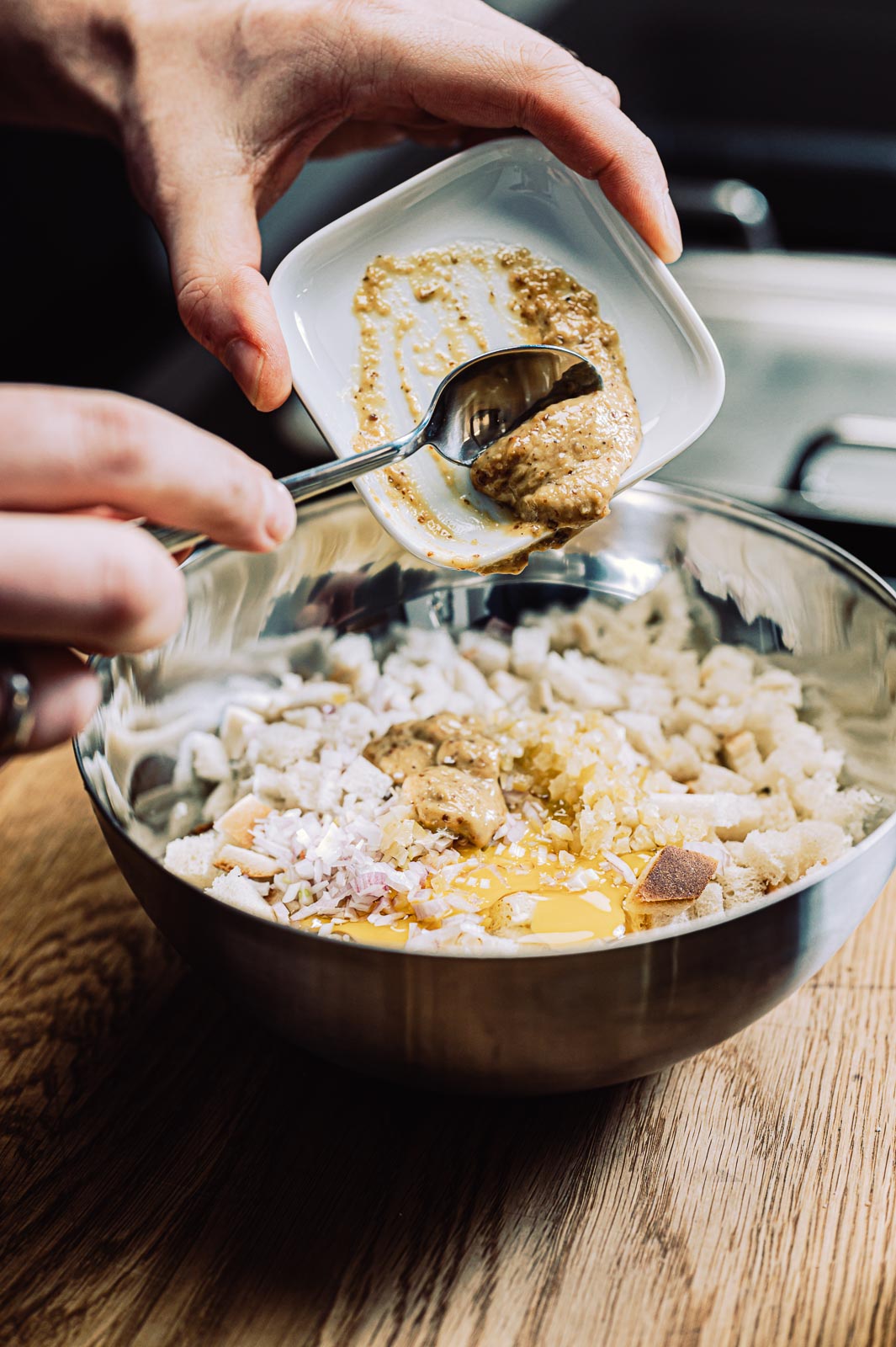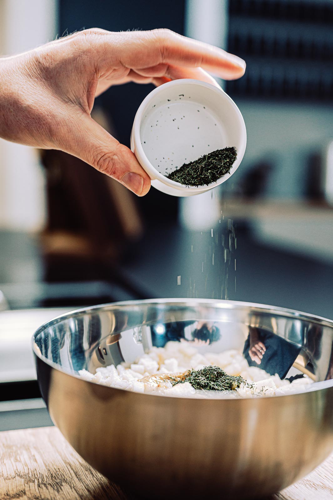 Den Lachs und das Toastbrot sehr fein würfeln. Die Schalotte abziehen, fein würfeln und mit dem Abrieb der Limette, Ei, Senf und Dill vermischen. Die Masse mit Salz und Pfeffer abschmecken.