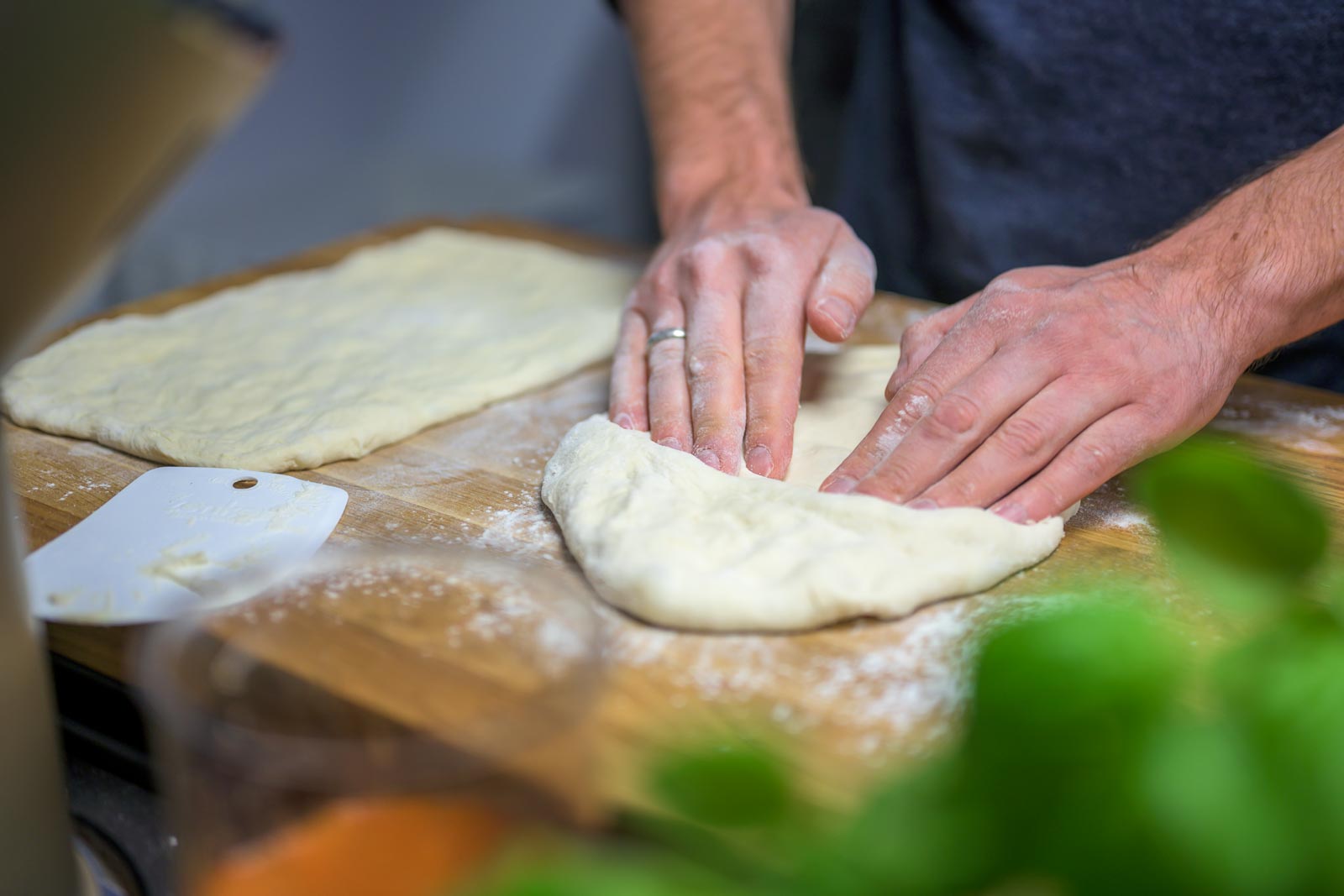Den Teig falten und zwei gleich große Stücke portionieren. Etwas ruhen lassen.