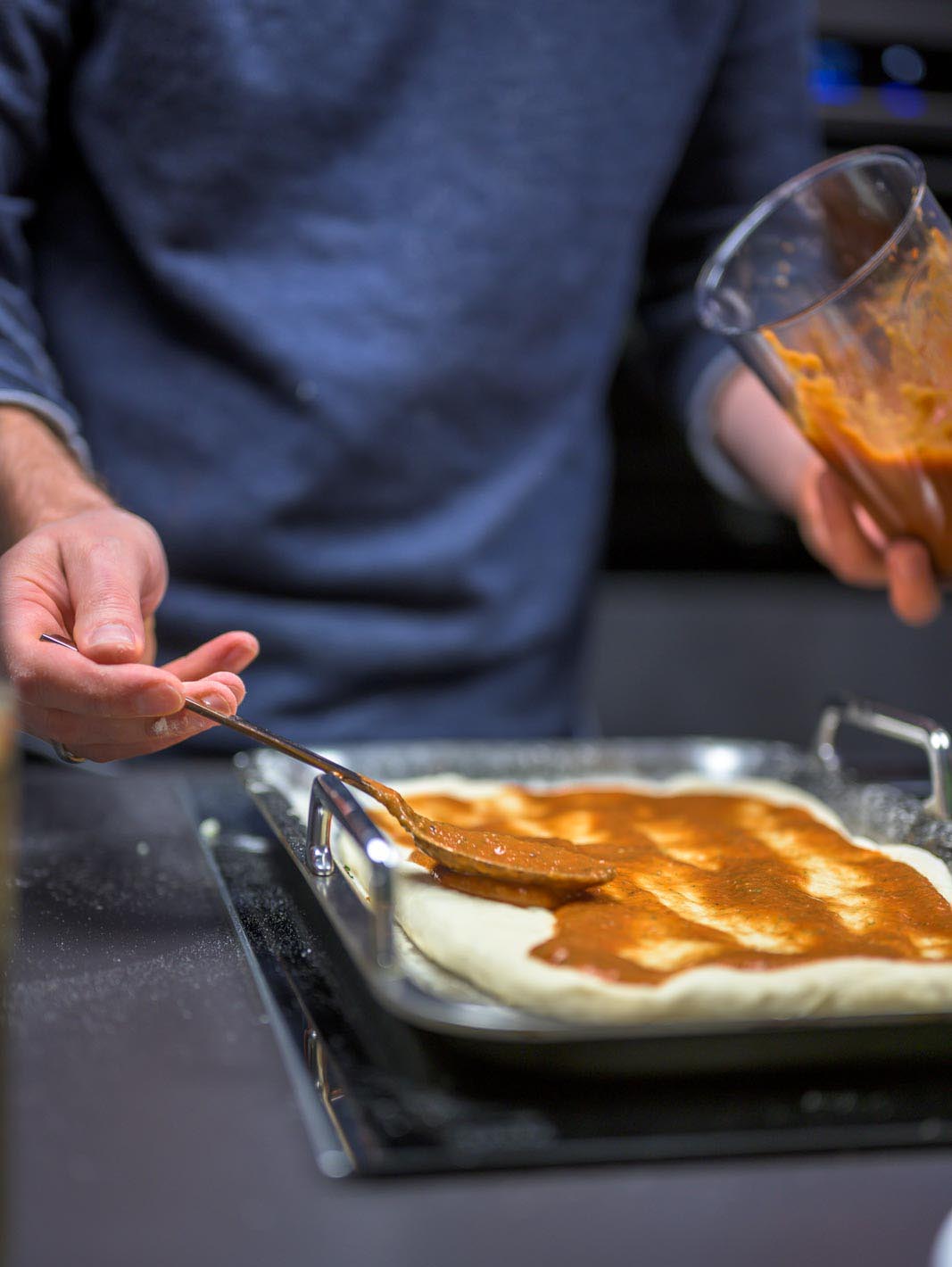 Den Teig auf die Teppan Yaki Grillplatte legen und mit Tomatensauce bestreichen. Nach Wunsch mit weiteren Zutaten belegen.