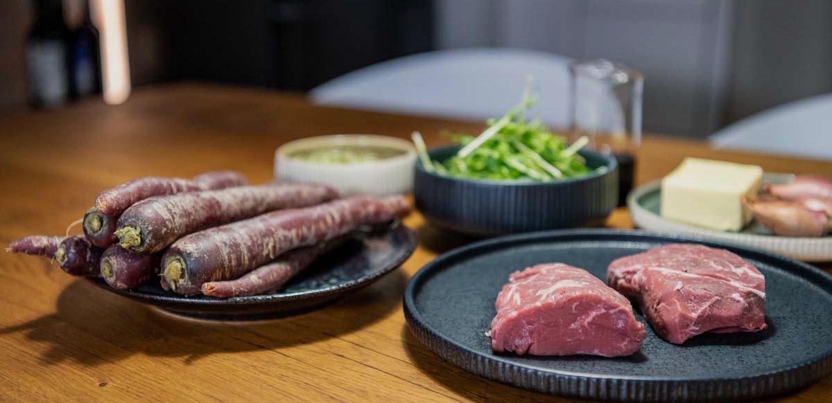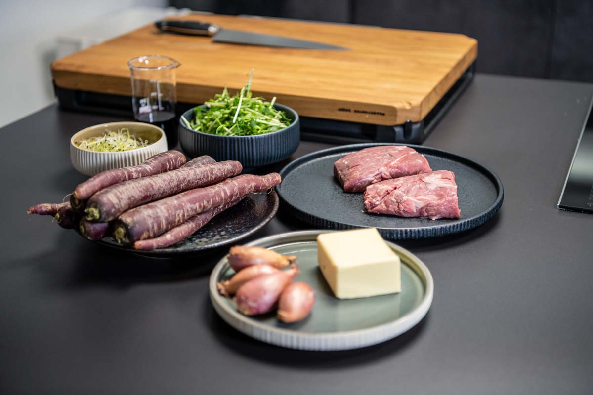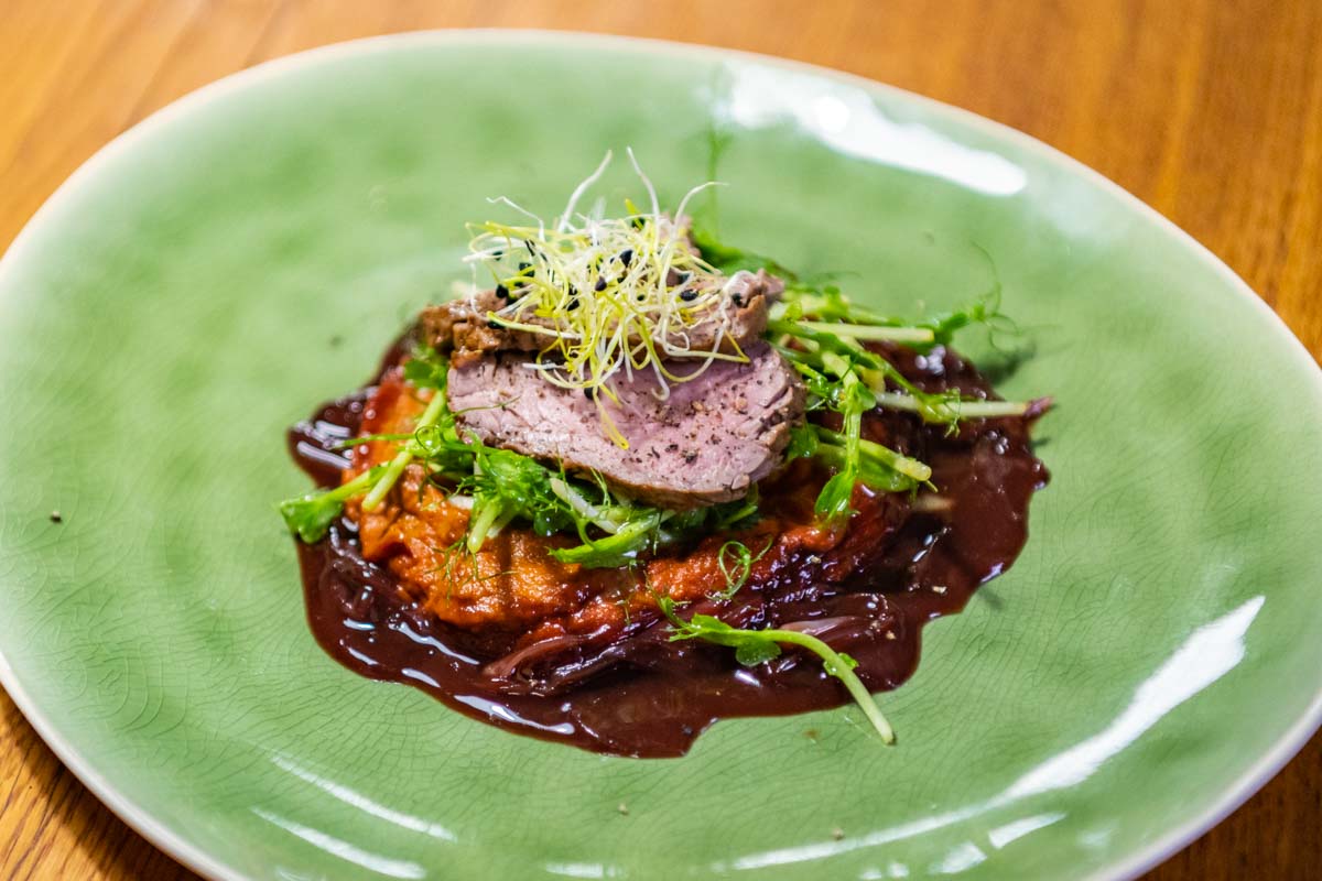 Rinderfilet mit Möhren-Püree, Erbsensprossen und Portwein-Jus.