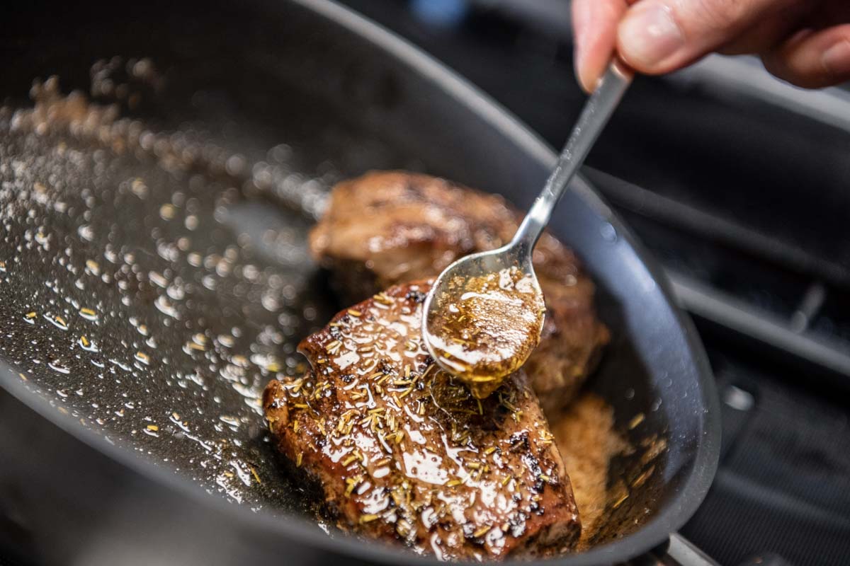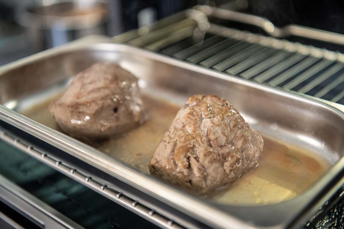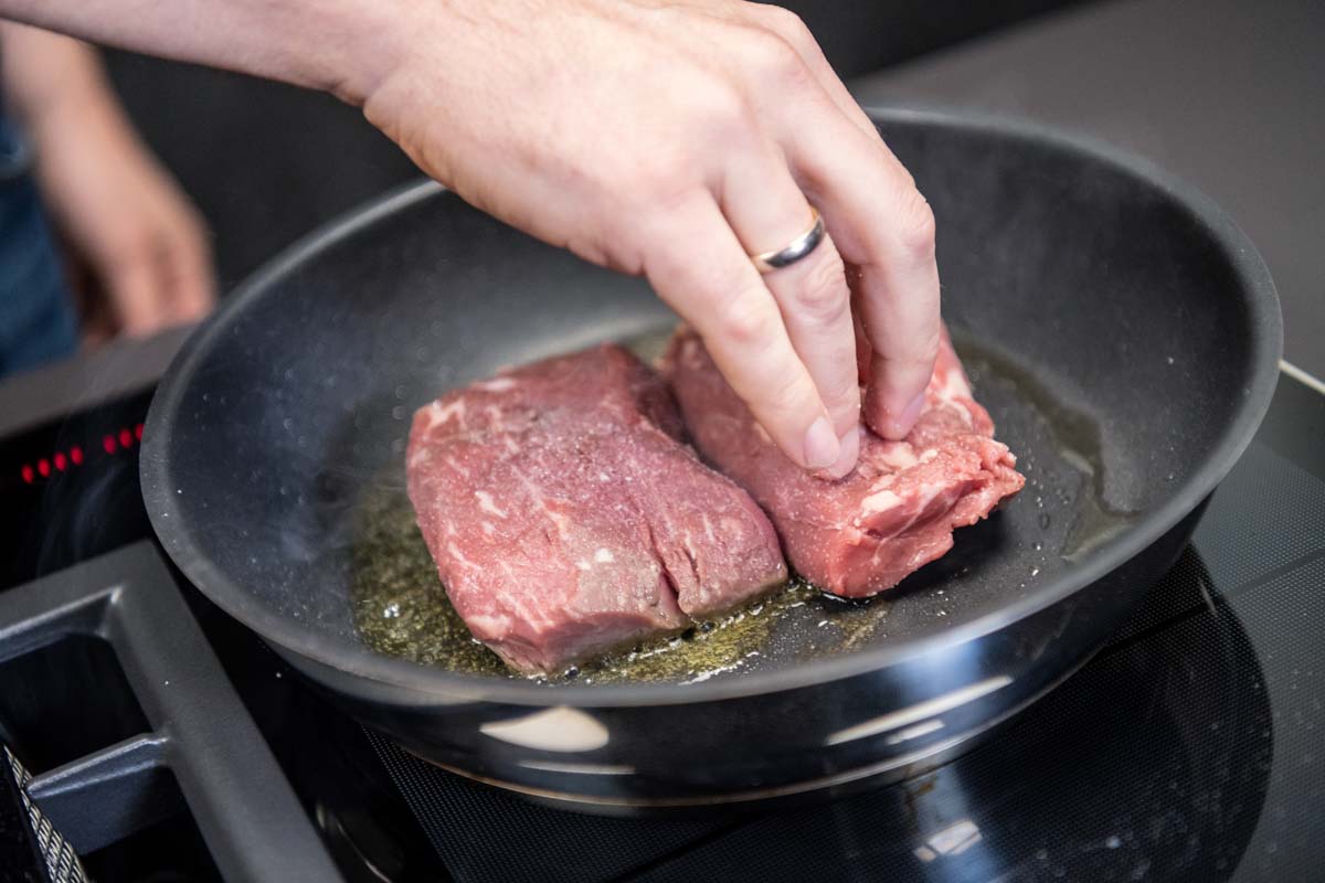 In einer neuen Pfanne 50 g Butter aufschäumen lassen und etwas getrockneten Rosmarin dazu geben. Das Fleisch in der Rosmarin-Butter schwenken und danach kurz ruhen lassen.