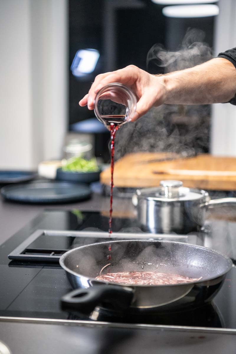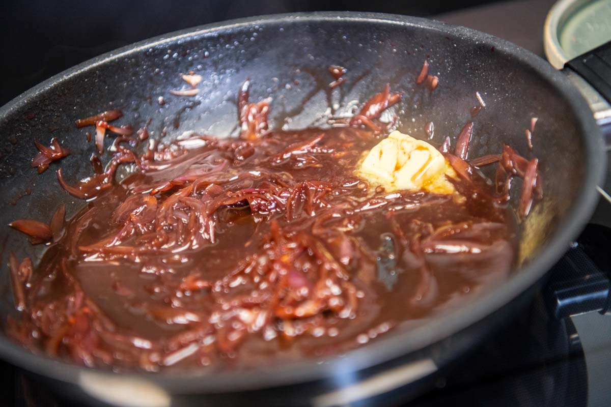 Die Schalotten abziehen und in dünne Streifen schneiden. Im Bratansatz in der Pfanne anschwitzen. Sie sollten nicht bräunen. Mit Portwein ablöschen und 5 min. köcheln lassen. Den Fond zufügen und solange kochen, bis nur noch der Boden der Pfanne mit Flüssigkeit bedeckt ist. Das Kochfeld ausschalten und 50 g kalte Butter einrühren. Mit Salz und dunklem Balsamico-Essig abschmecken.