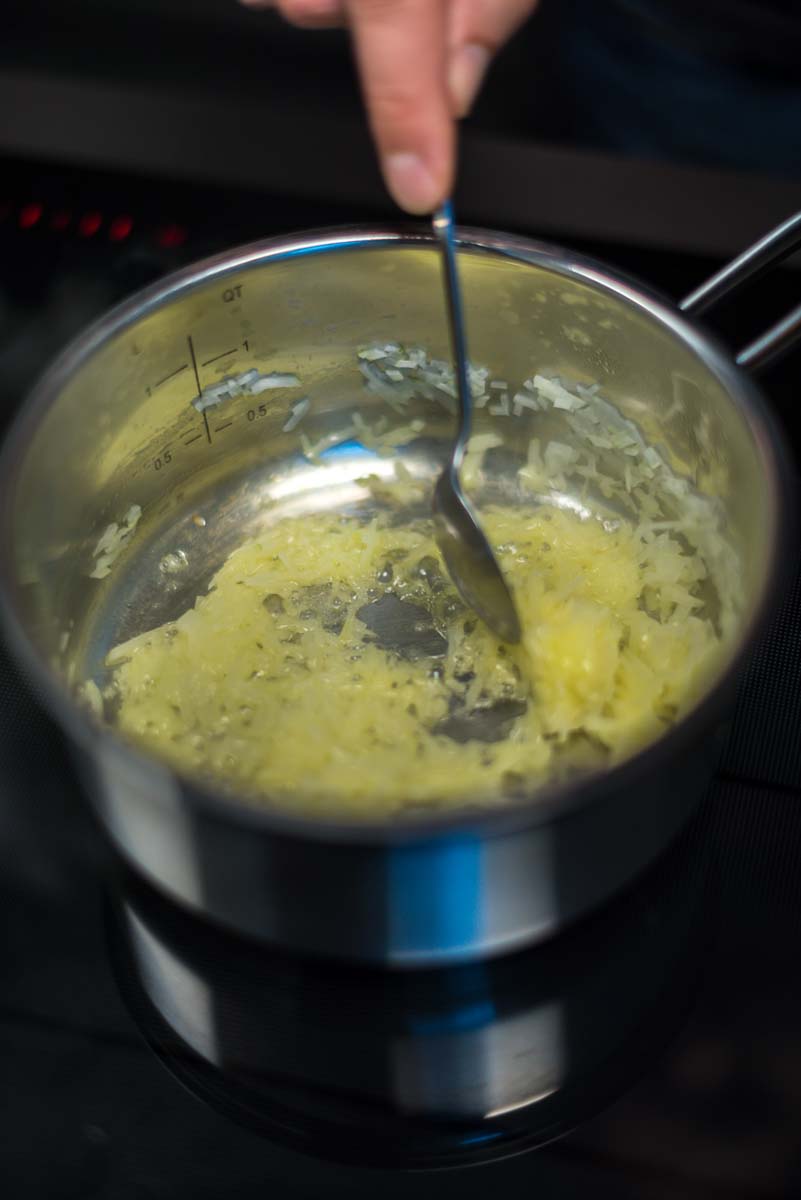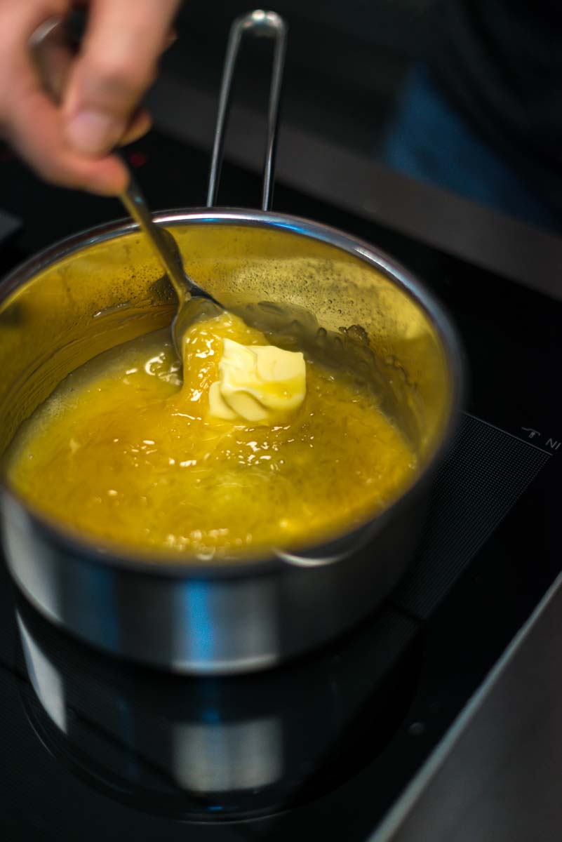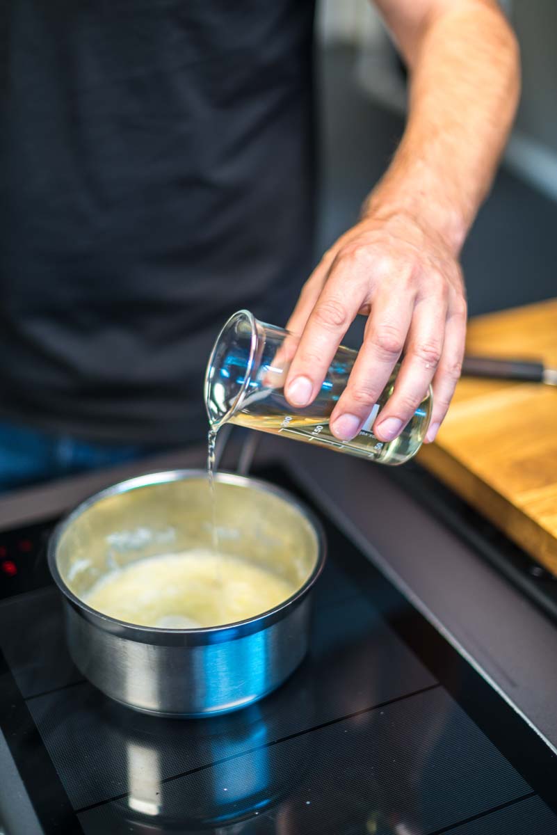 Die Zwiebel fein würfeln und bei milder Hitze in etwas Butter glasig anschwitzen. Mit Weißwein und Essig ablöschen und auf 1/4 einkochen. Die Reduktion sollte schon etwas eindicken. Nach und nach die kalte Butter einrühren, so dass ein gebundene Sauce entsteht.
