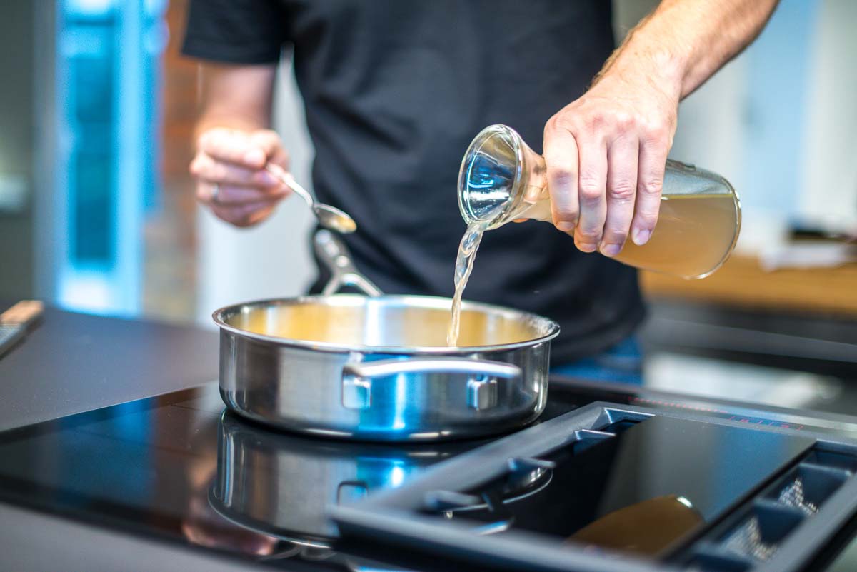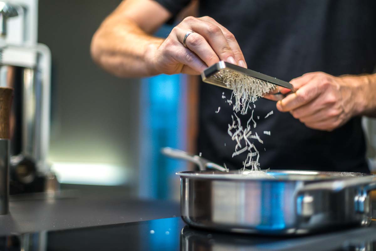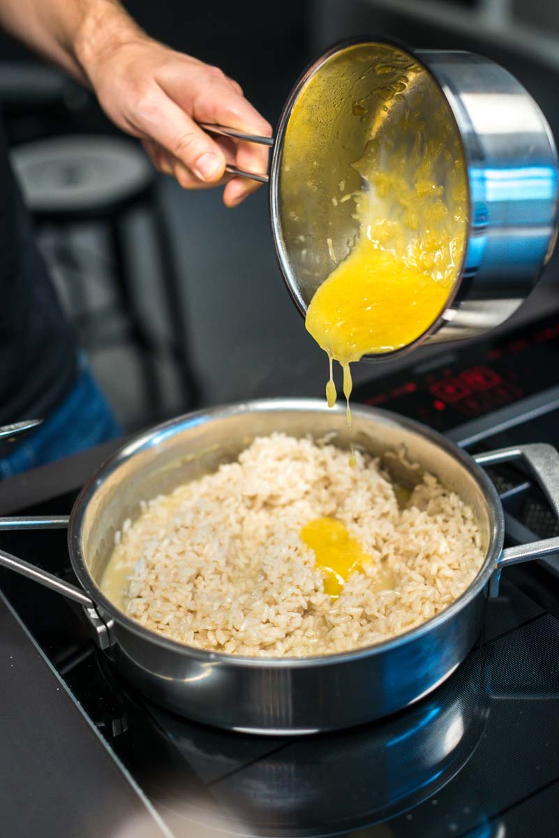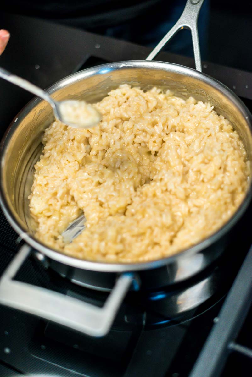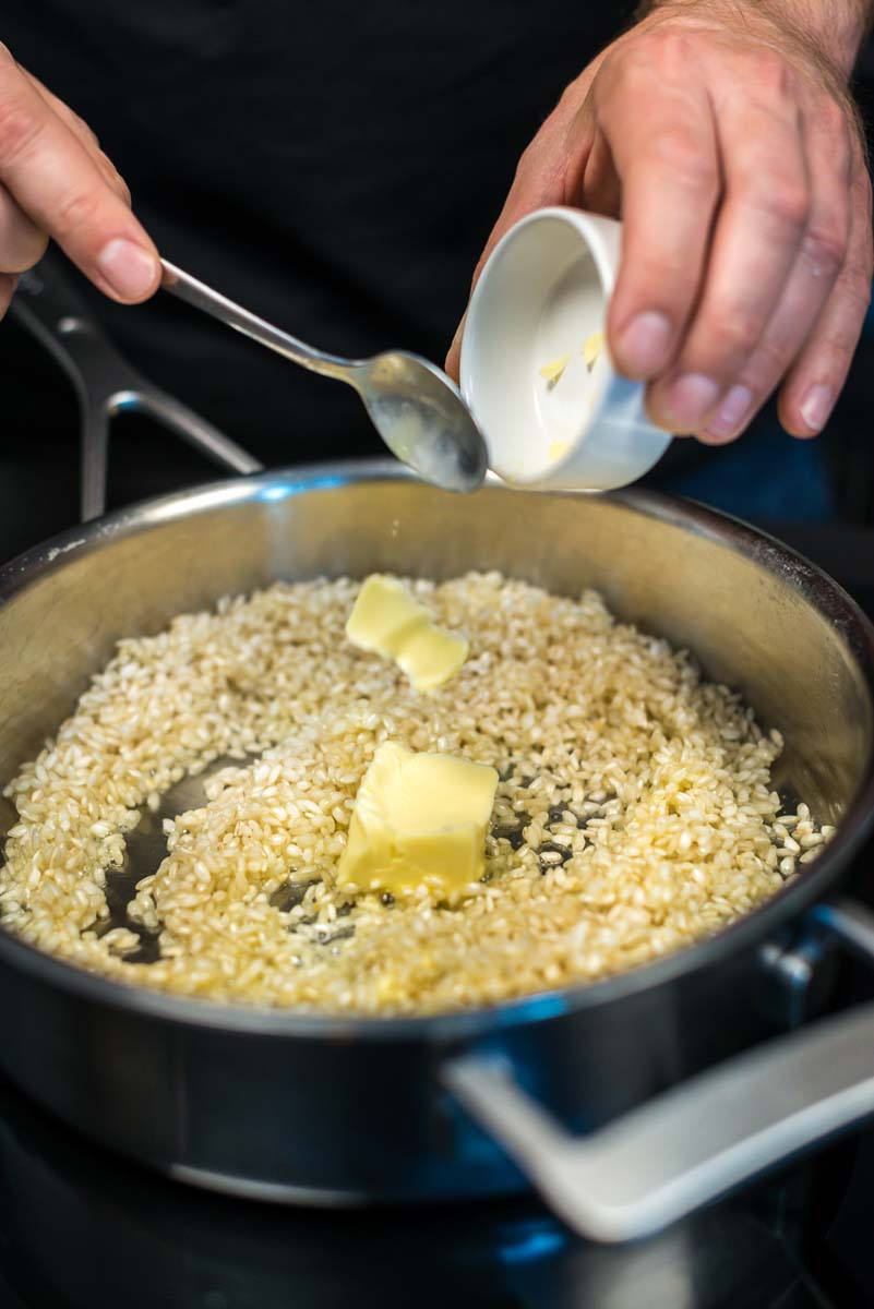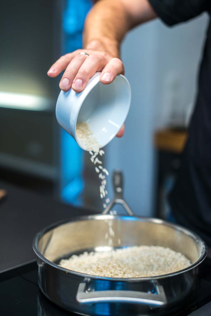 Entscheidend ist der Reis. Wir verwenden die Sorte Carnaroli oder Arborio. Die Brühe muss übrigens nicht nach und nach zugefügt werden.