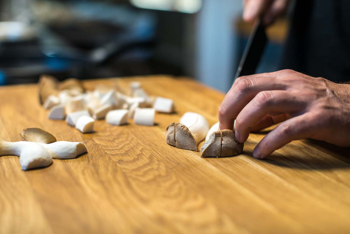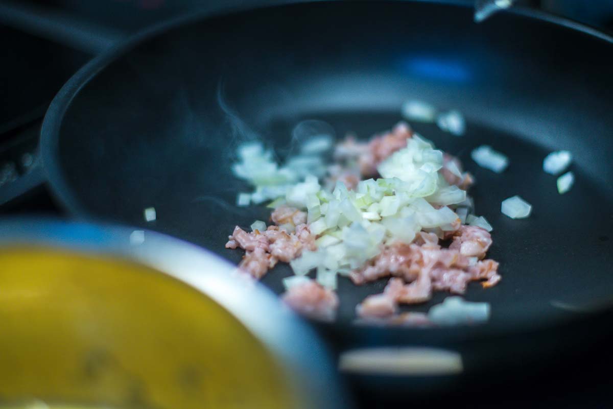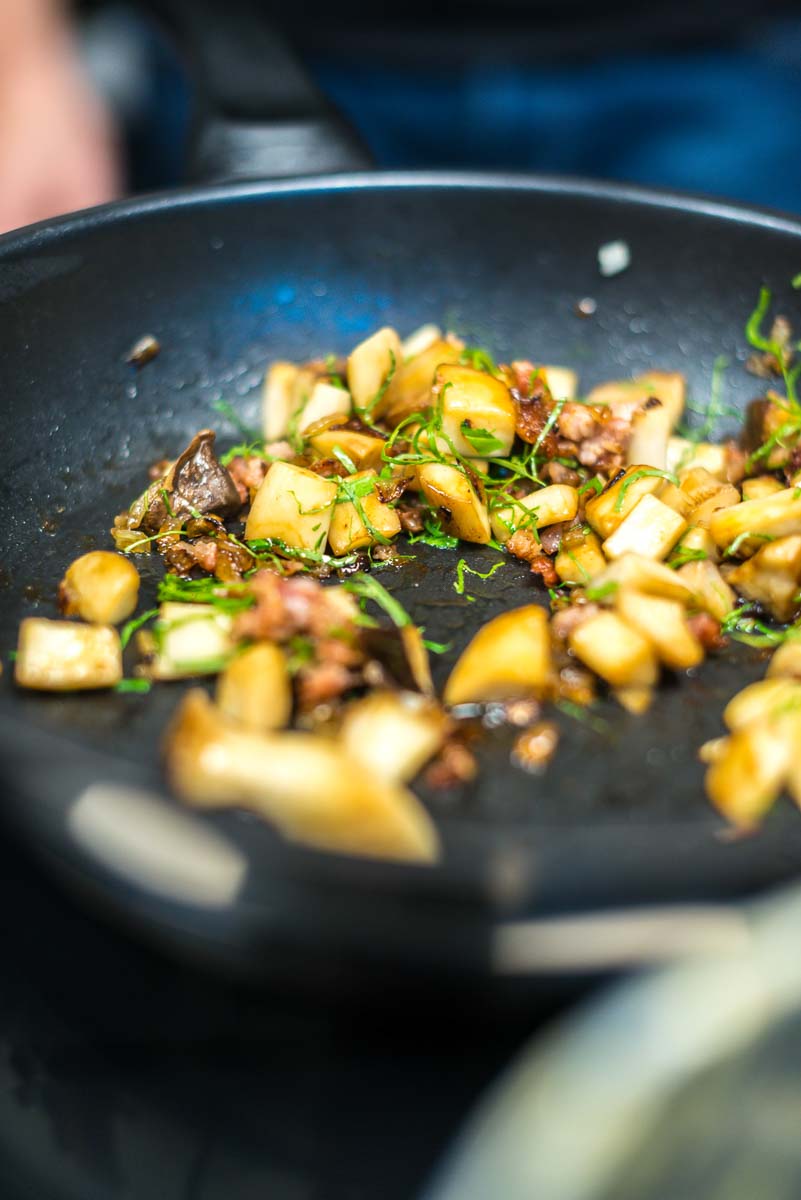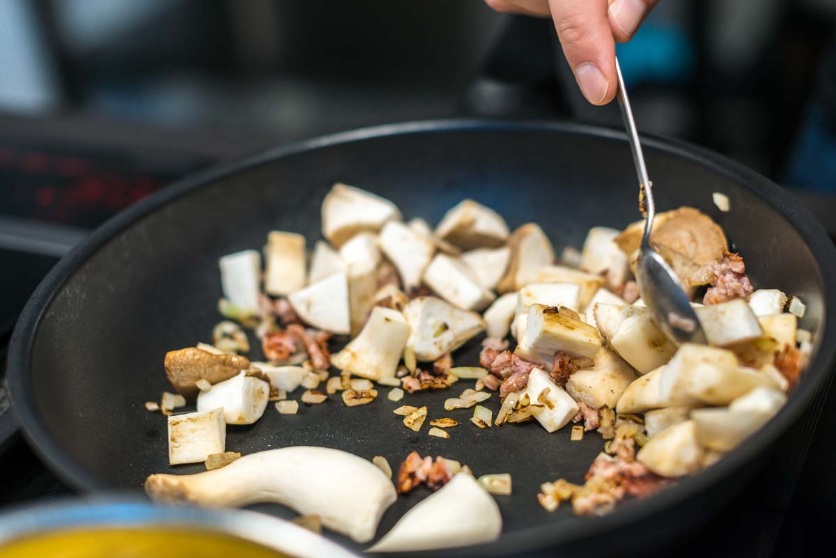 Die Pilze in nicht zu kleine Stücke schneiden. Die Zwiebel abziehen und zusammen mit den Bacon-Scheiben fein würfeln. Den Bacon in einer Pfanne ohne Fett anrösten. Die Zwiebelwürfel zufügen und glasig anschwitzen. Dann die Pilze zufügen und anrösten. Sie sollten nicht zu weich werden. Zum Schluss die Basilikum-Blätter in feine Streifen schneiden und zu den Pilzen geben.